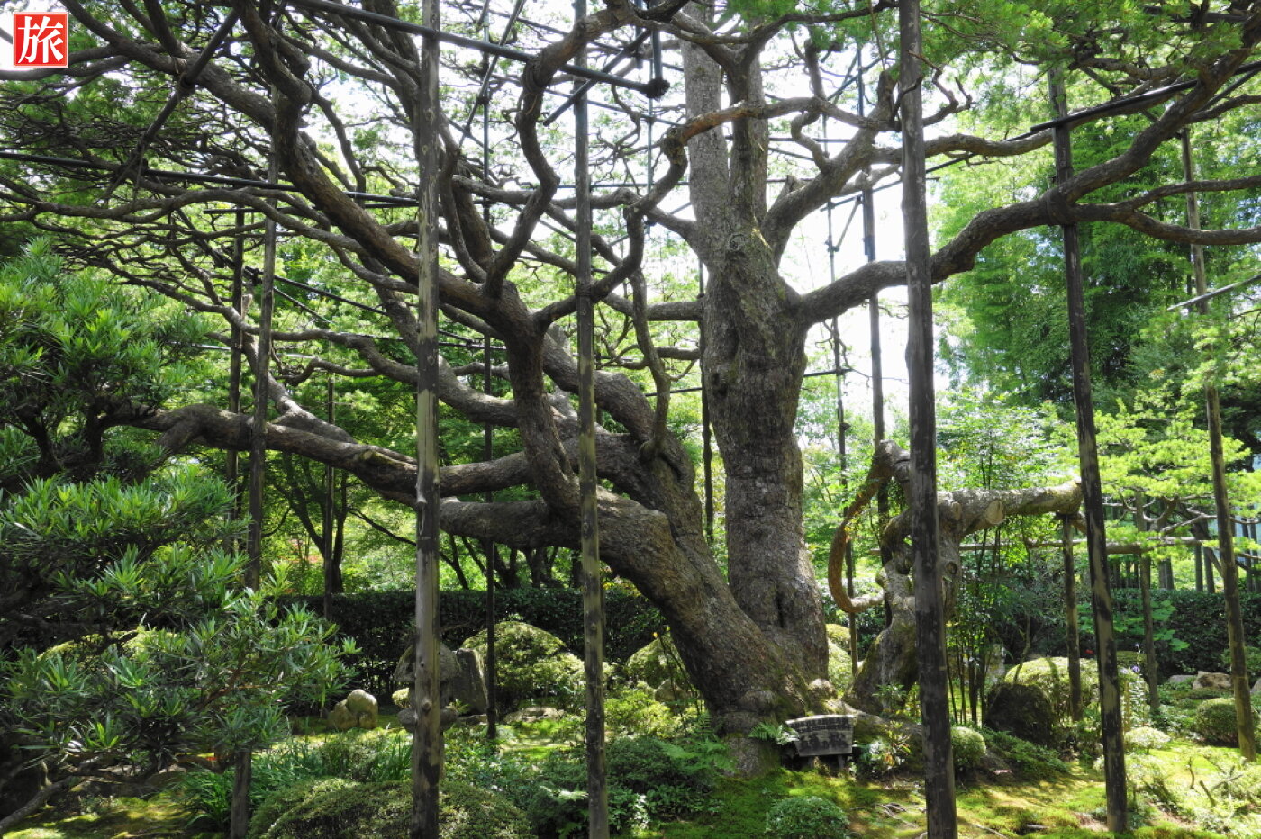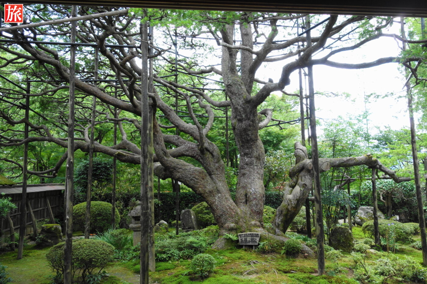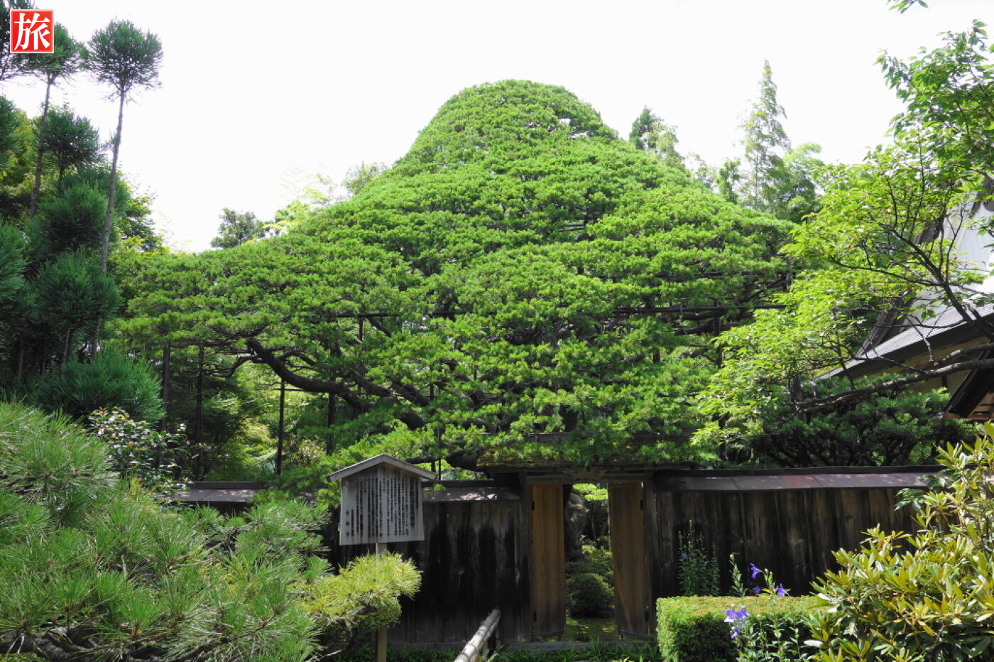 客殿の風景。樹齢700年といわれる「巨大五葉松」を客殿から望む。