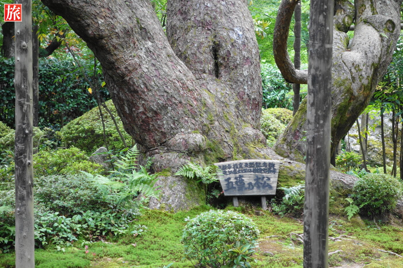 五葉の松を客殿奥から柱を額に収め眺めた様子。斜め方向から柱と柱の空間を額に見たててた額縁の庭園。竹林を楽しめる。