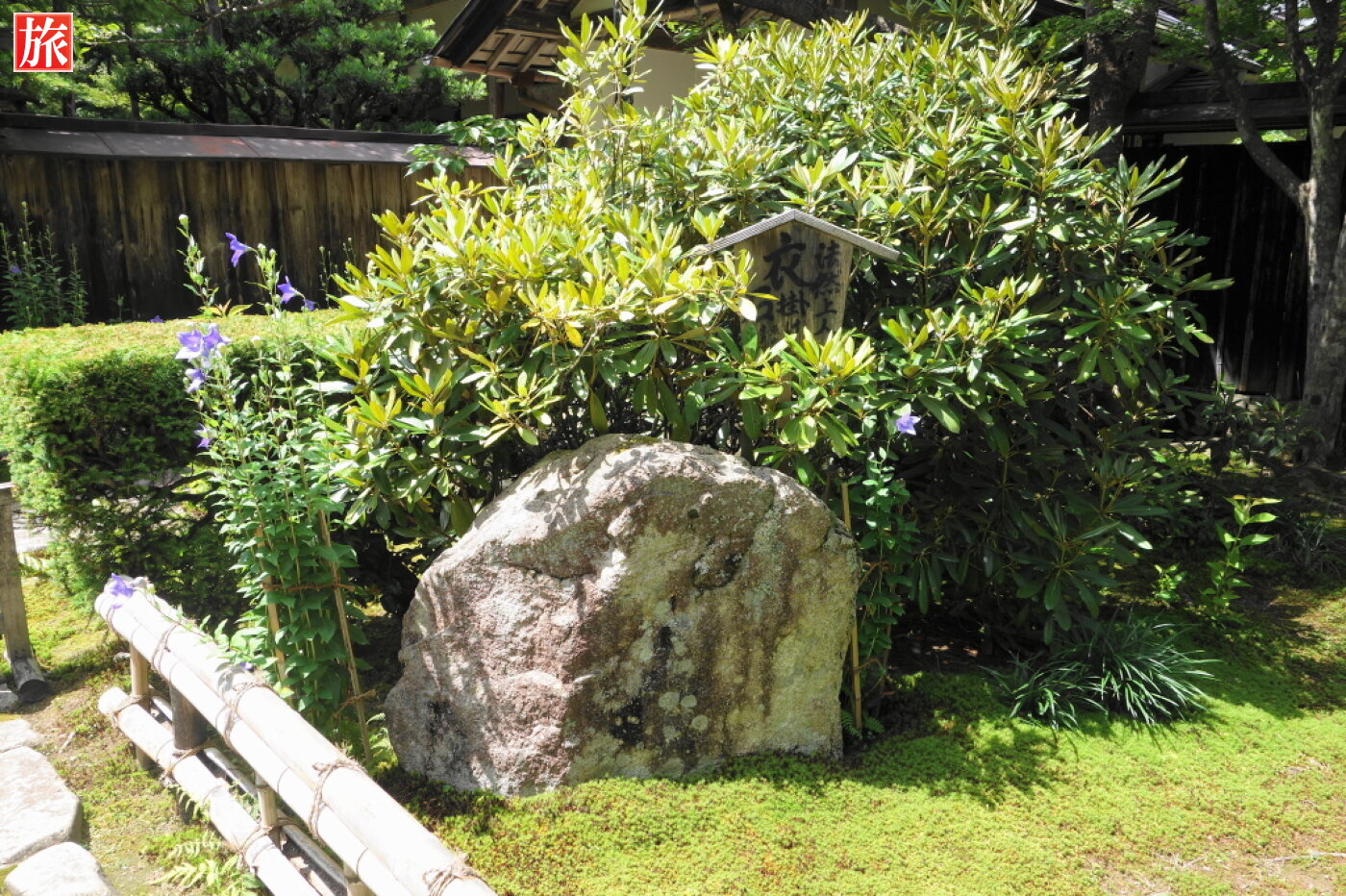 ゴヨウマツの説明板。旧玄関前の法然上人衣掛けの石。鶴亀庭園。池の形が鶴、築山が亀、山茶花の 古木を蓬莱山とみる名園。