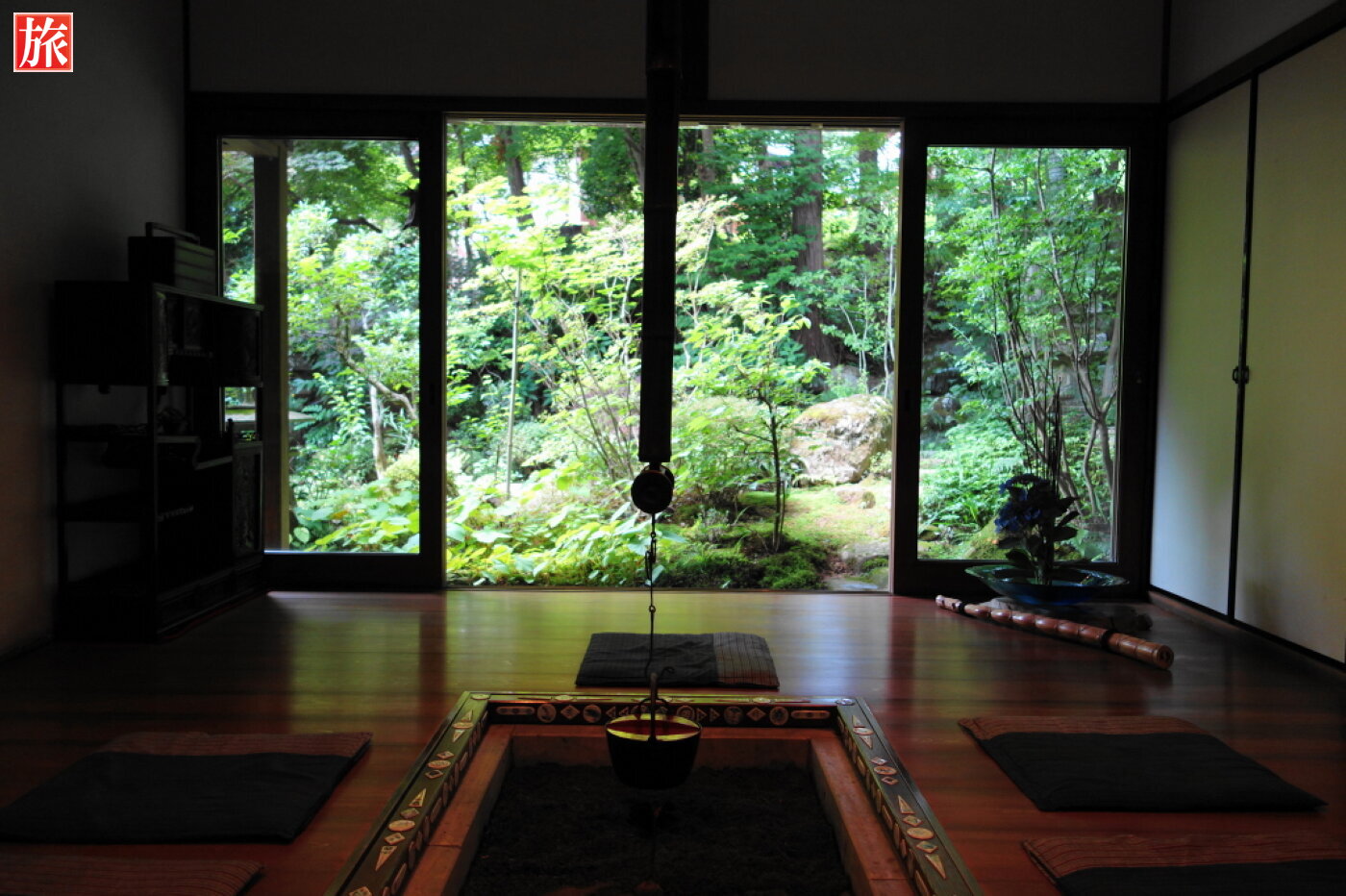 囲炉裏の部屋。盤桓園(ばんかんえん)南方の五葉の松。お抹茶、オリジナルのお菓子(若狭屋手作りの和菓子)。