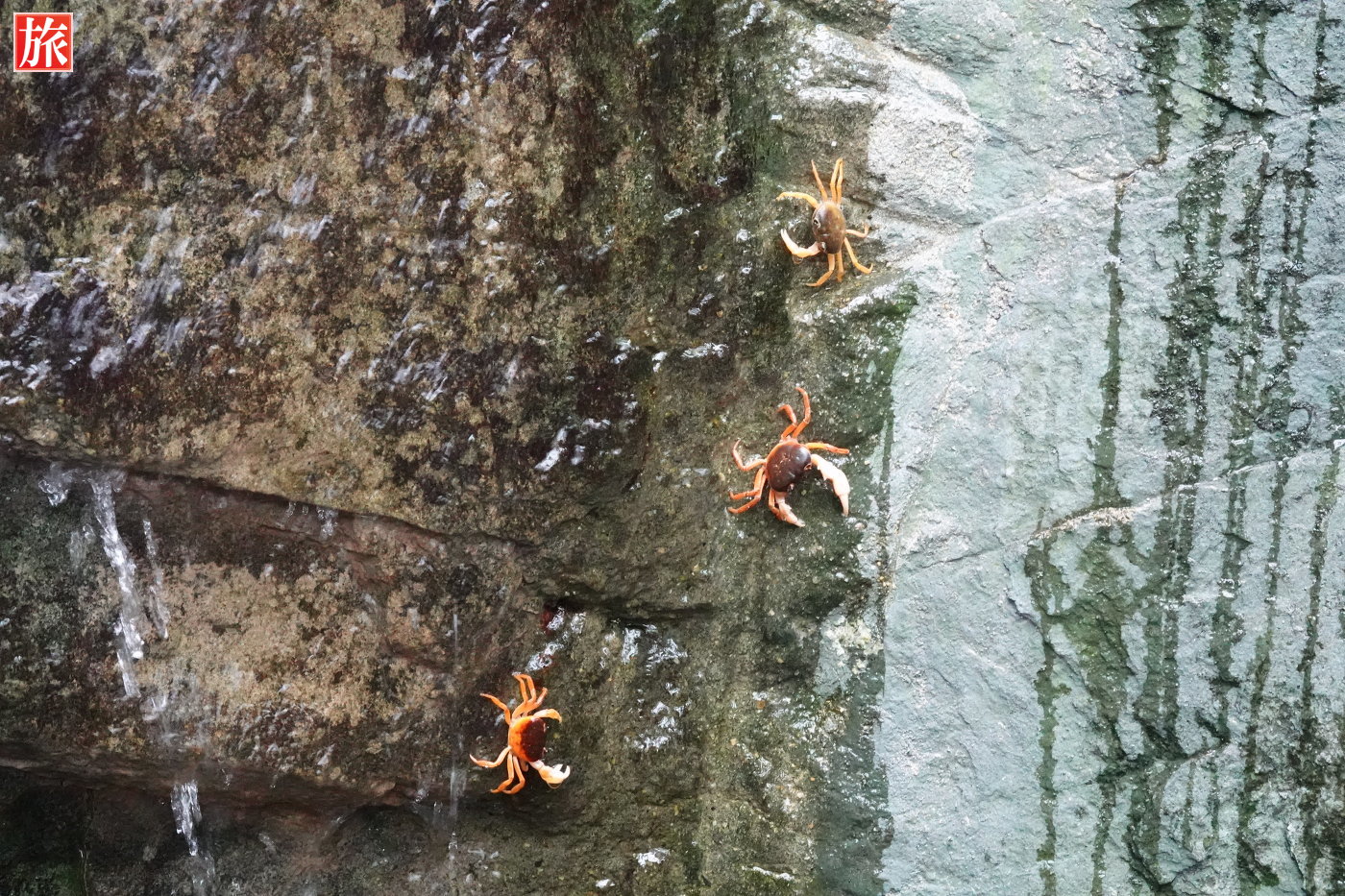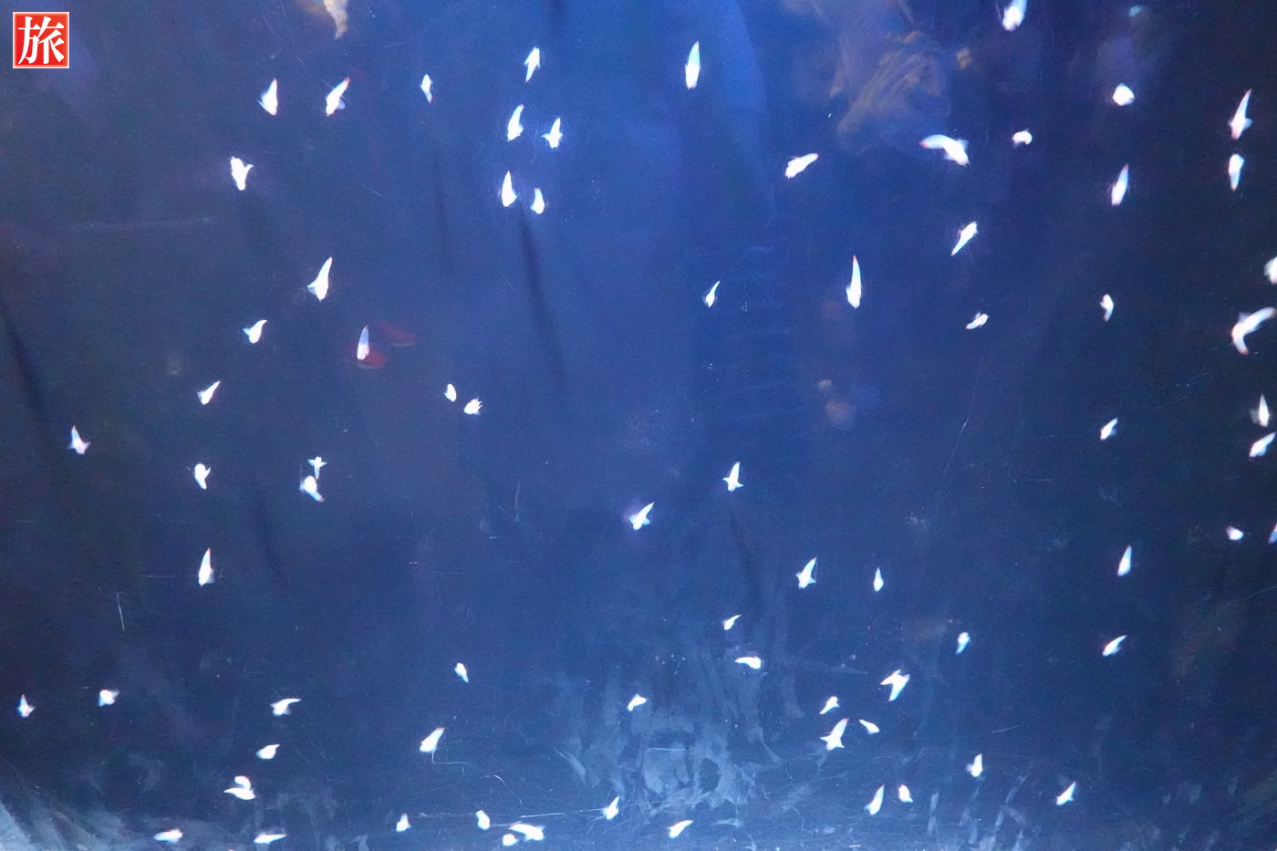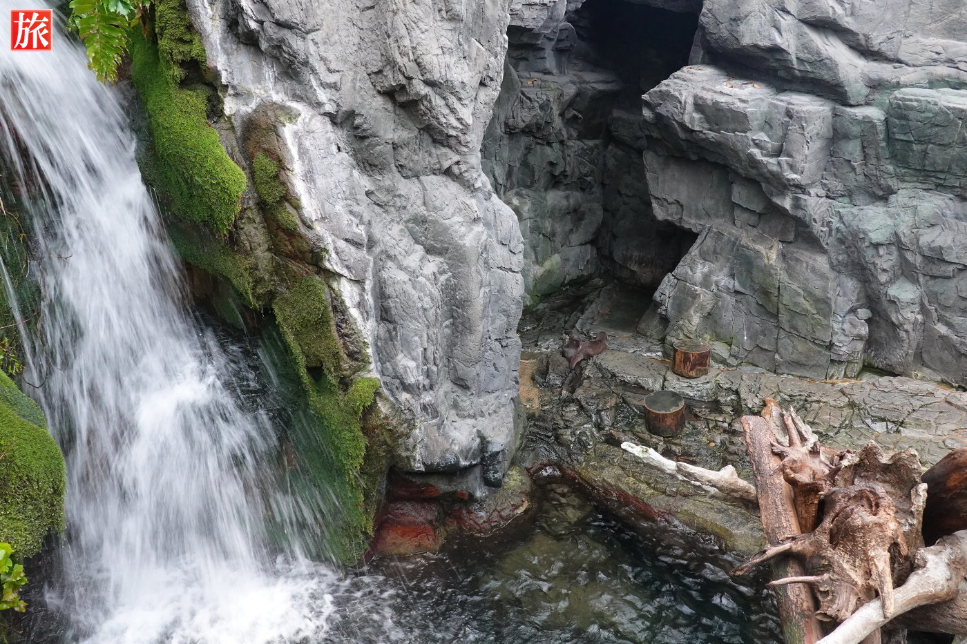 迫力のジンベエザメ・モニュメント。エスカレーターで下り日本の森へ。滝やらサワガニなど