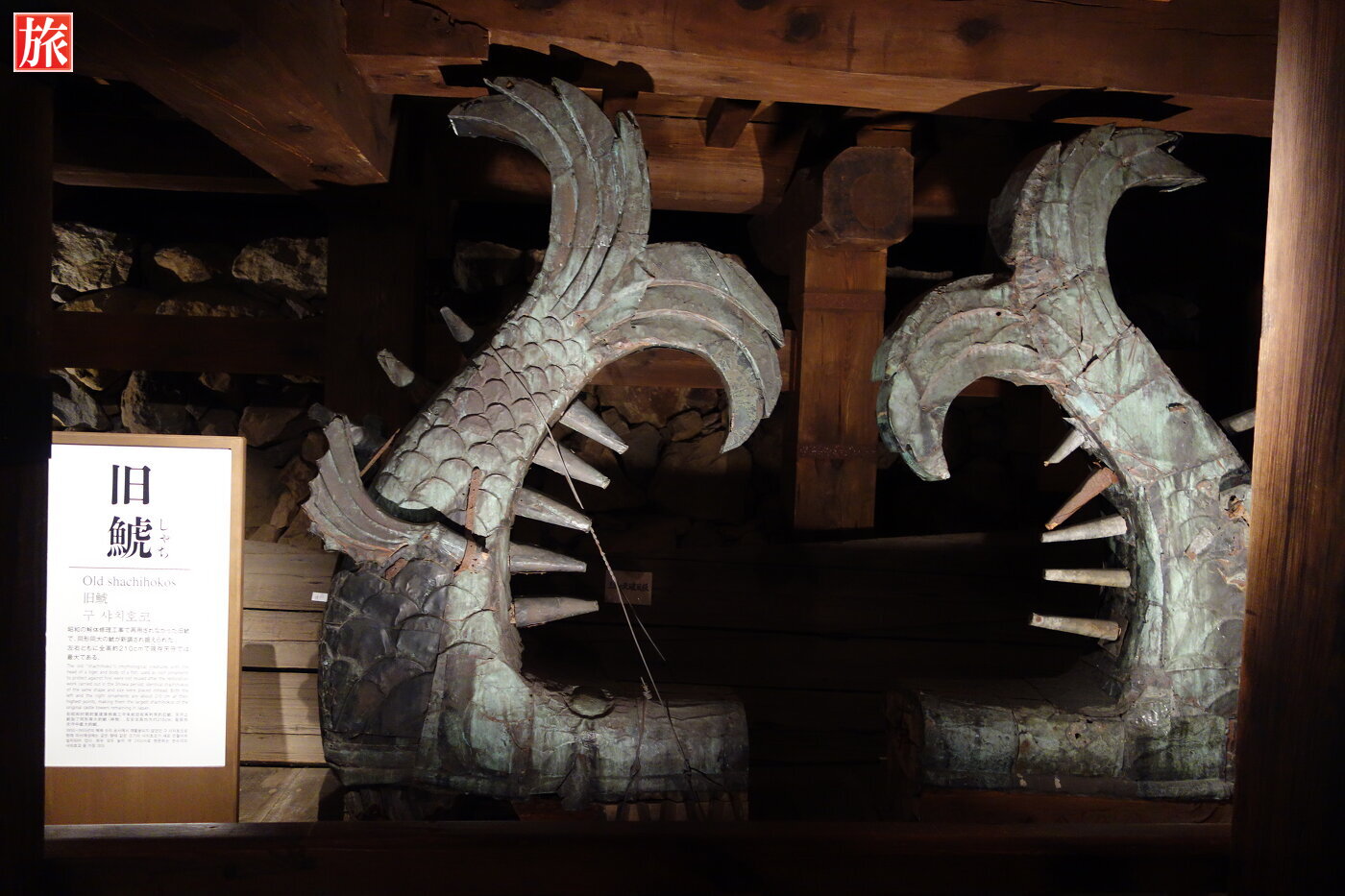現在、天守にそびえる鯱は木造のものでは日本最大。高さは約2m。城に初めて用いられたのは、織田信長が1579年に築いた安土城(滋賀県近江八幡市)とされる。