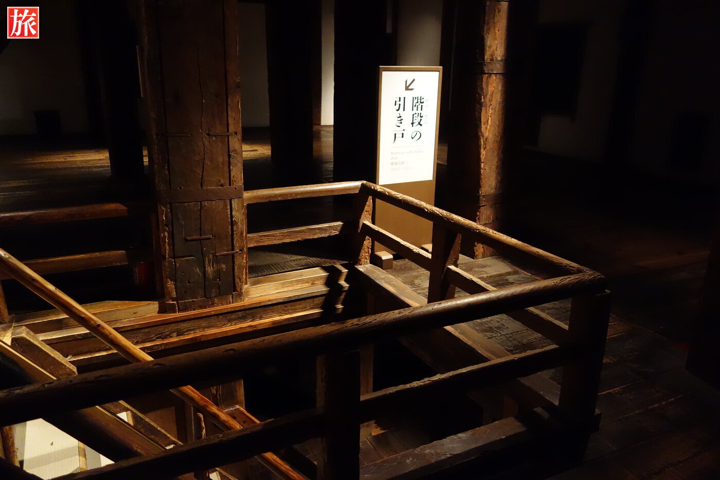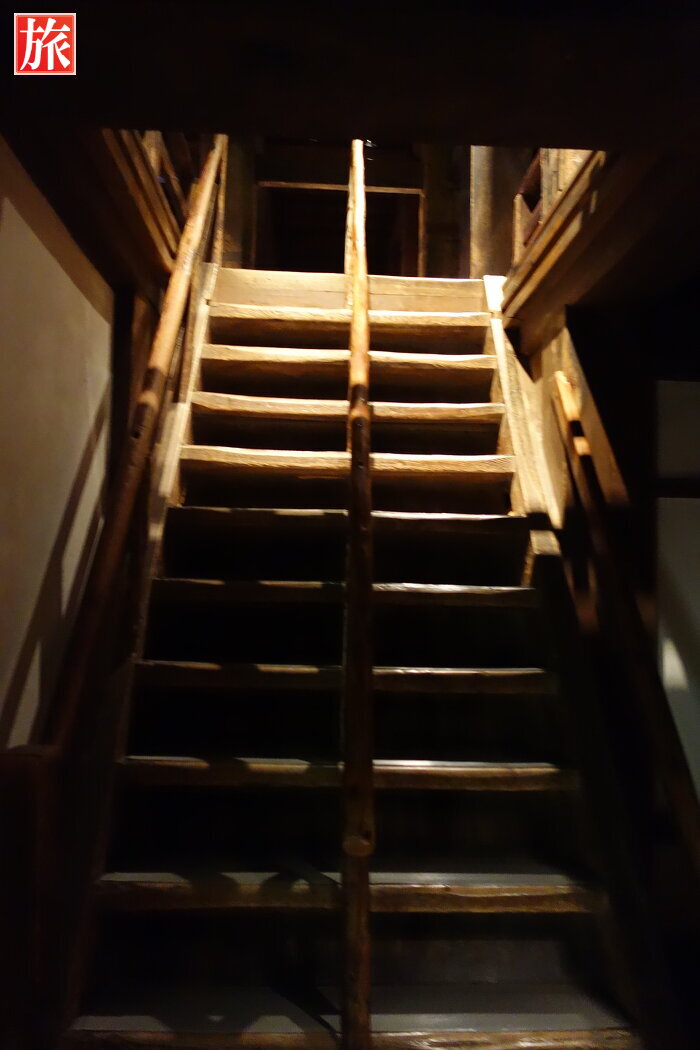 急勾配な階段。階段開口部をふさぐための水平引き戸が設置されている。