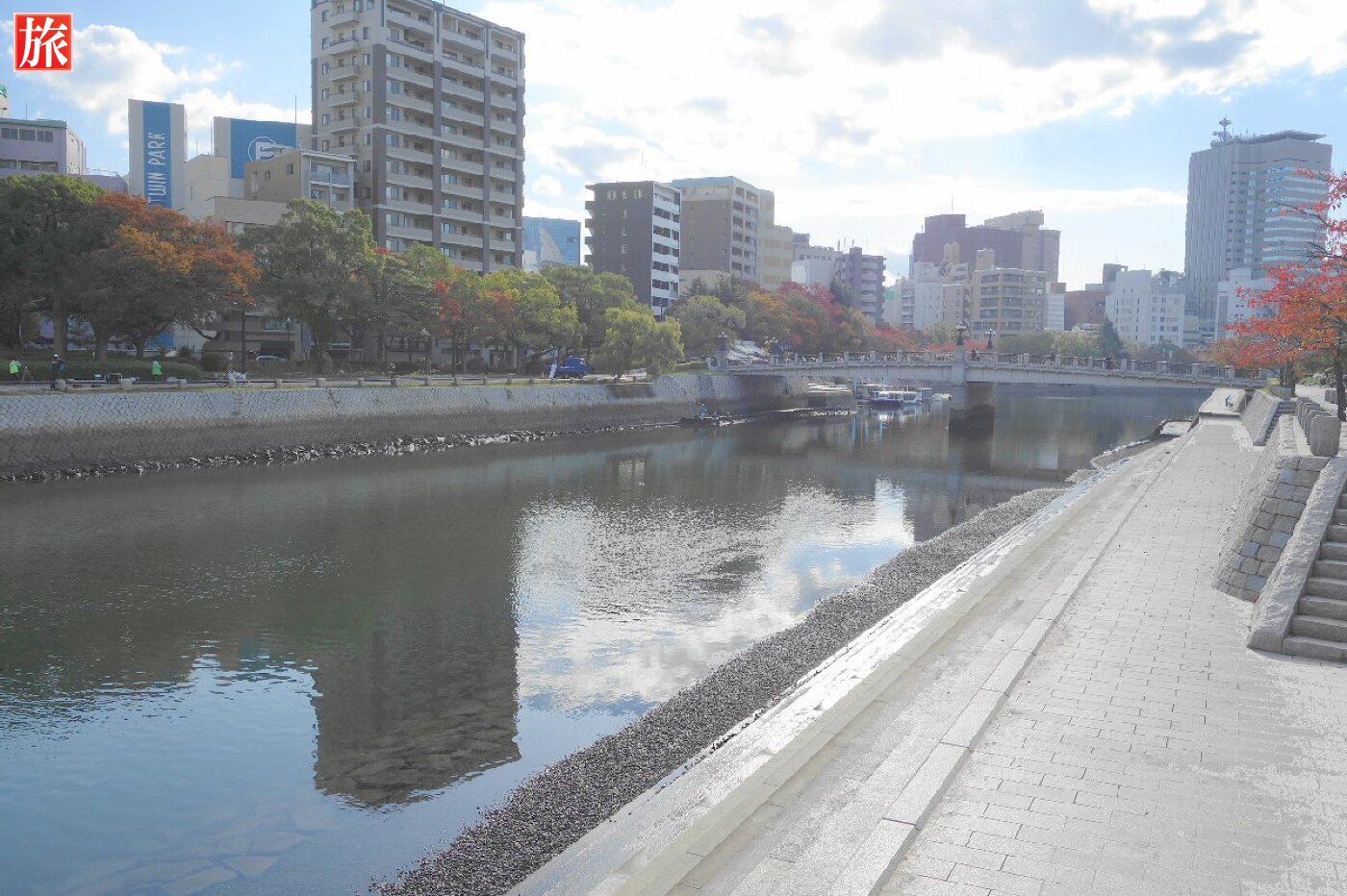 内務省職員殉職之碑近くで原爆ドームを見上げる。元安川を下流方向を見た様子です。下流方向には元安橋があります。