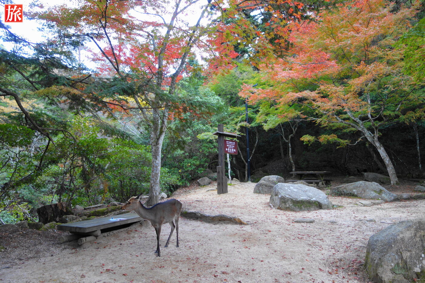 天然記念物に指定されている弥山原始林の麓にある公園で、宮島の紅葉の名所。モミジ、カエデの古木が多く、11月ごろになるとあたり一面が美しく紅葉したカエデに包まれる。なかでも紅葉谷周辺は最も美しいスポットの一つ。