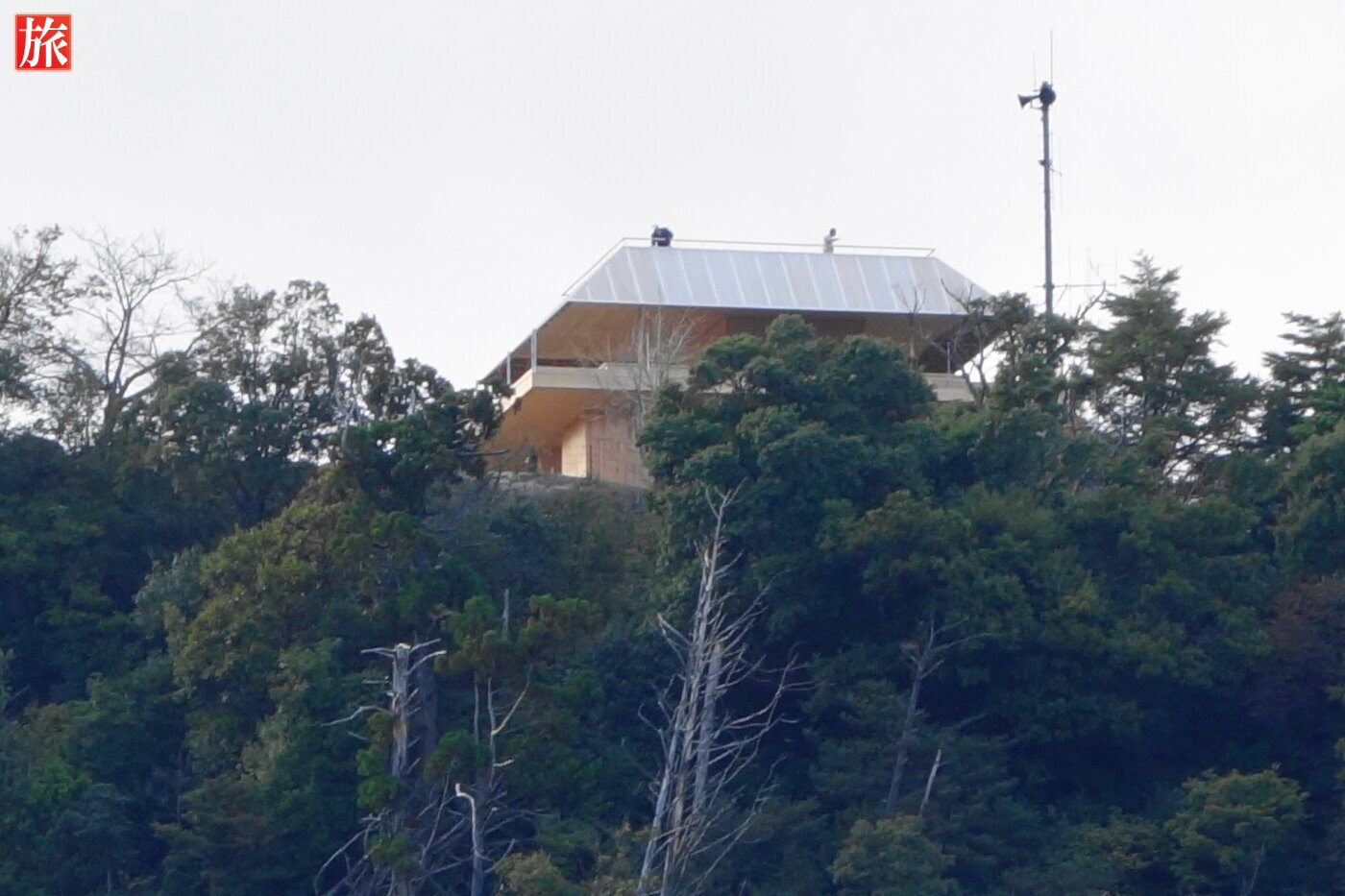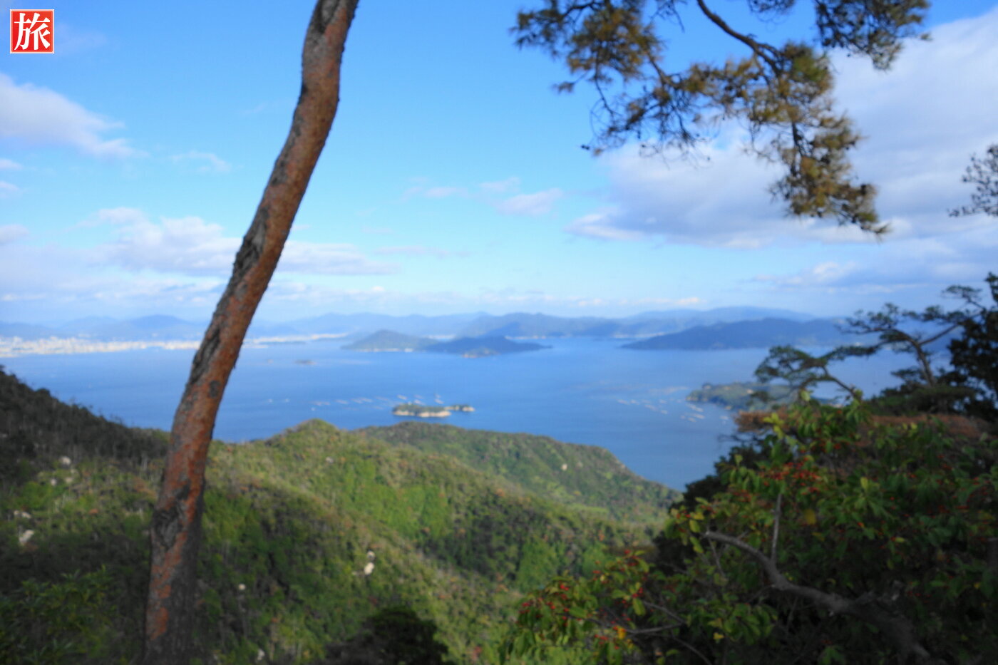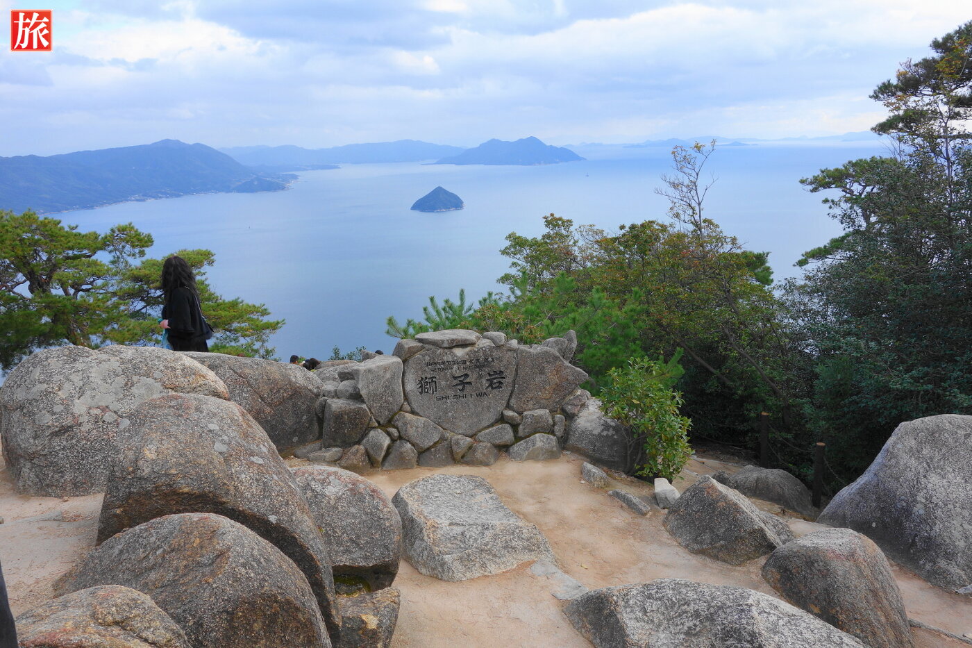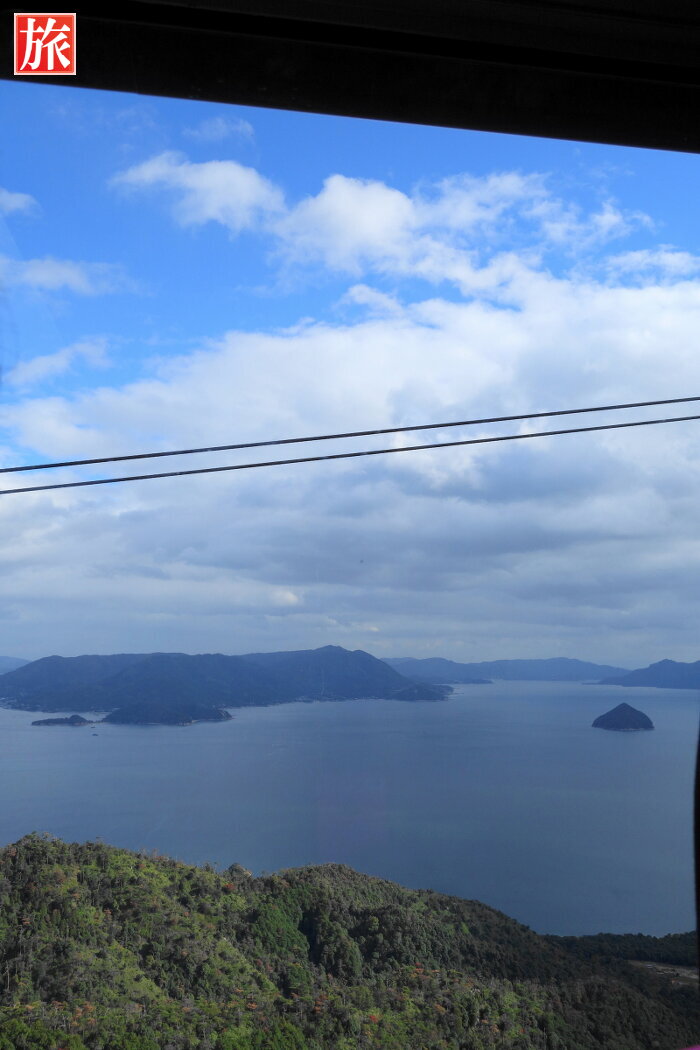 車窓から見た瀬戸内海に点在するたくさんの島々。獅子岩駅に到着しました。獅子岩駅から見た山頂。