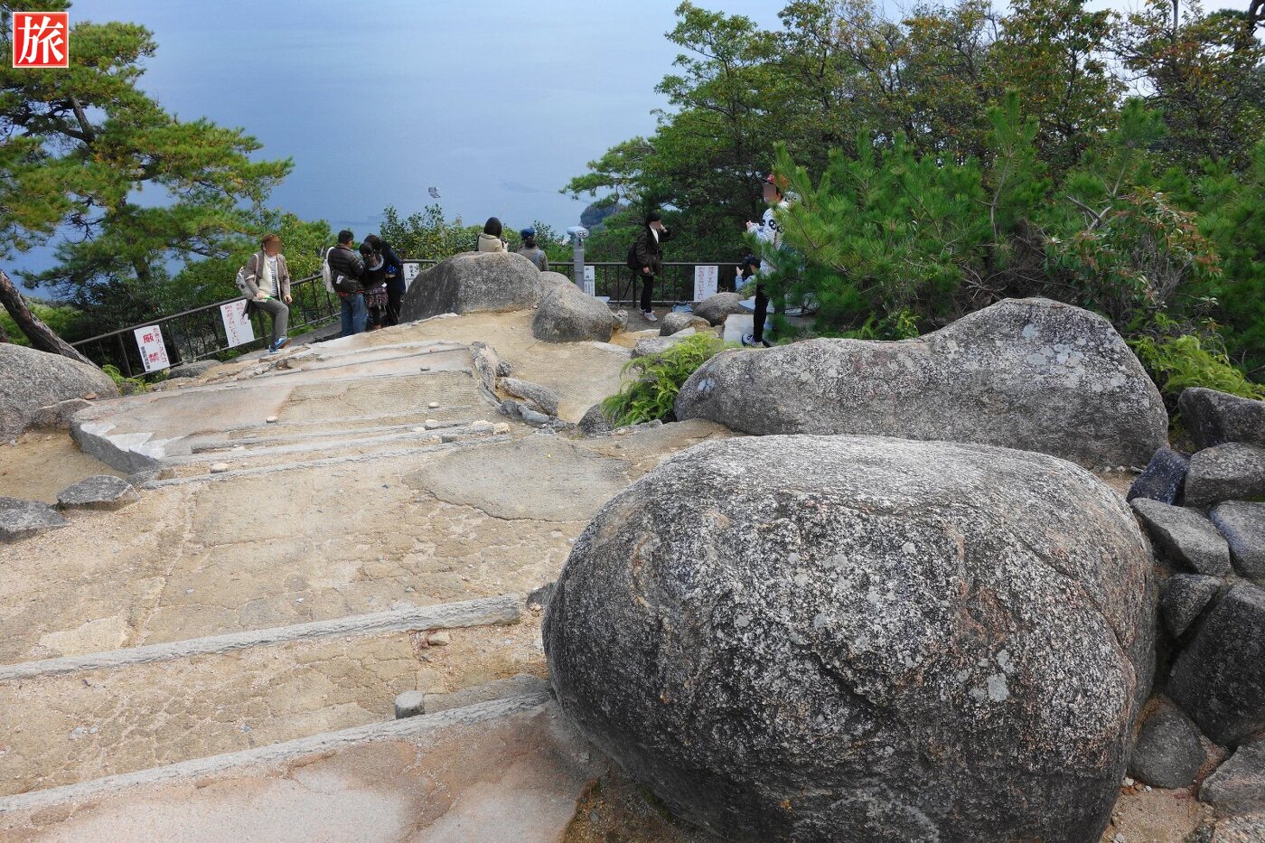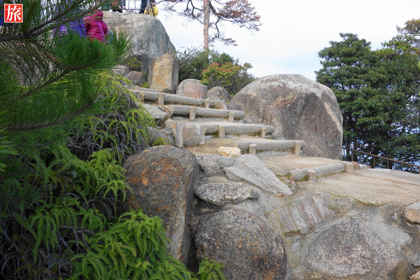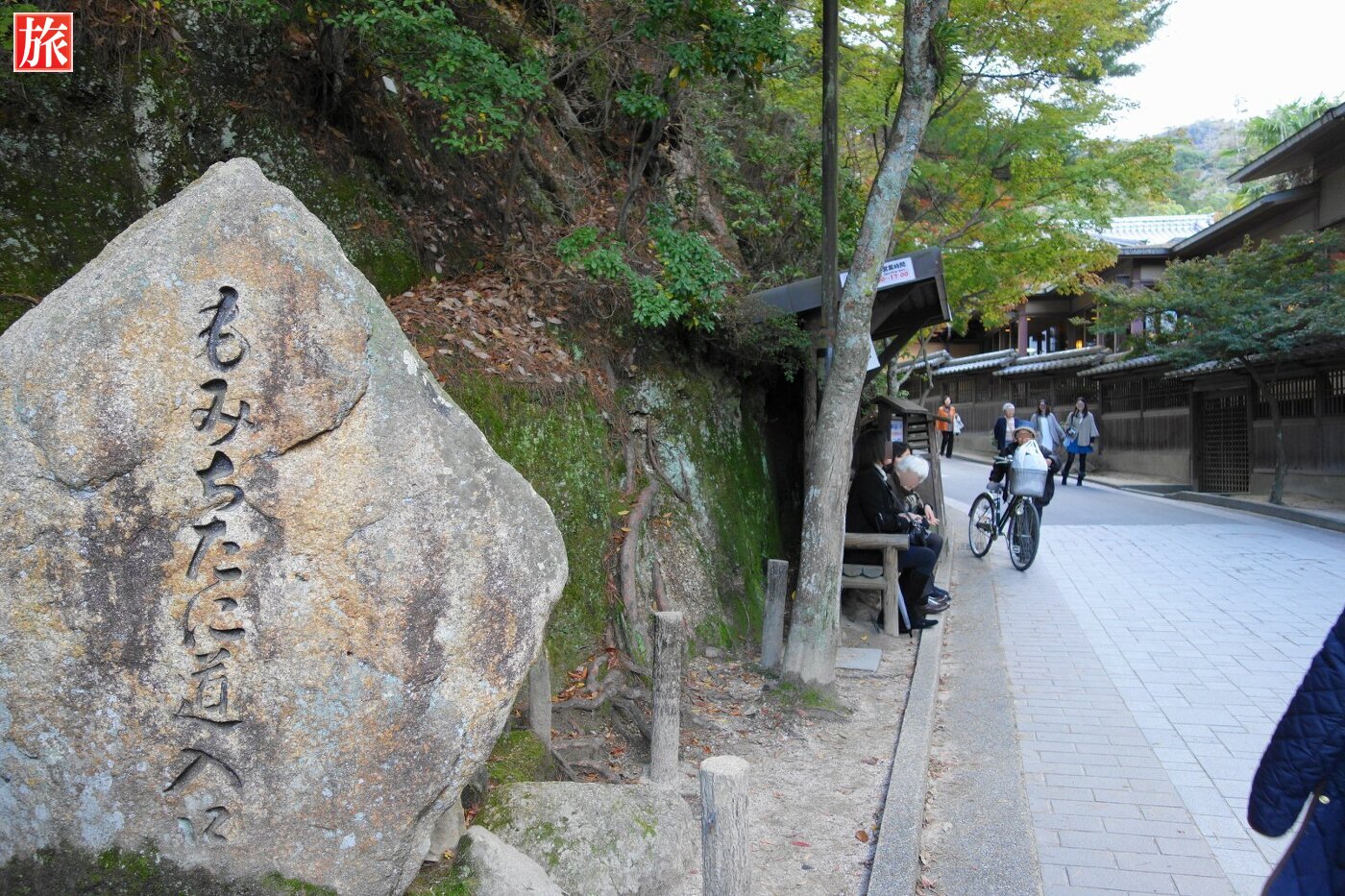 獅子岩駅からロープウエーで下ります。宮島ロープウエーの紅葉谷駅まで無料バスが運行しています。「もみじたに道入口」の自然石碑。