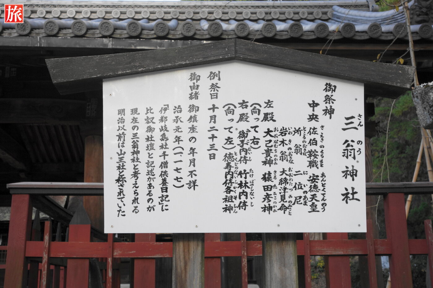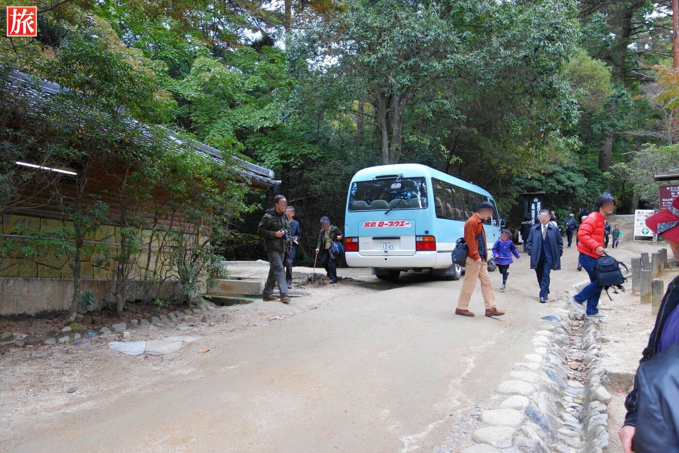「もみじたに道入口」の自然石碑近くにある無料送迎バス亭です。嚴島神社の摂社、三翁神社です。三翁神社の説明版。