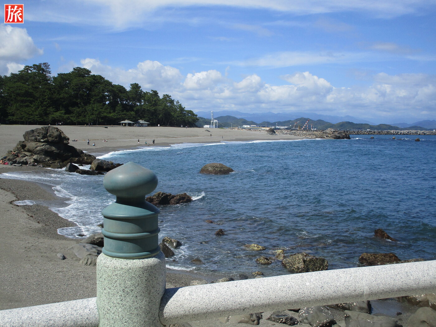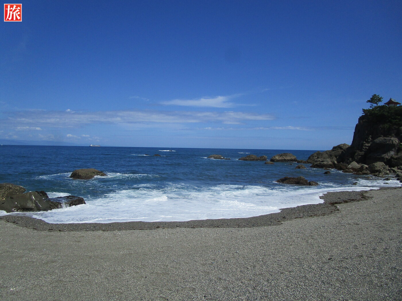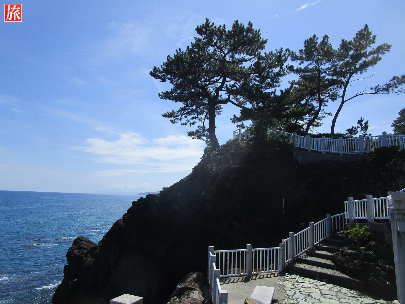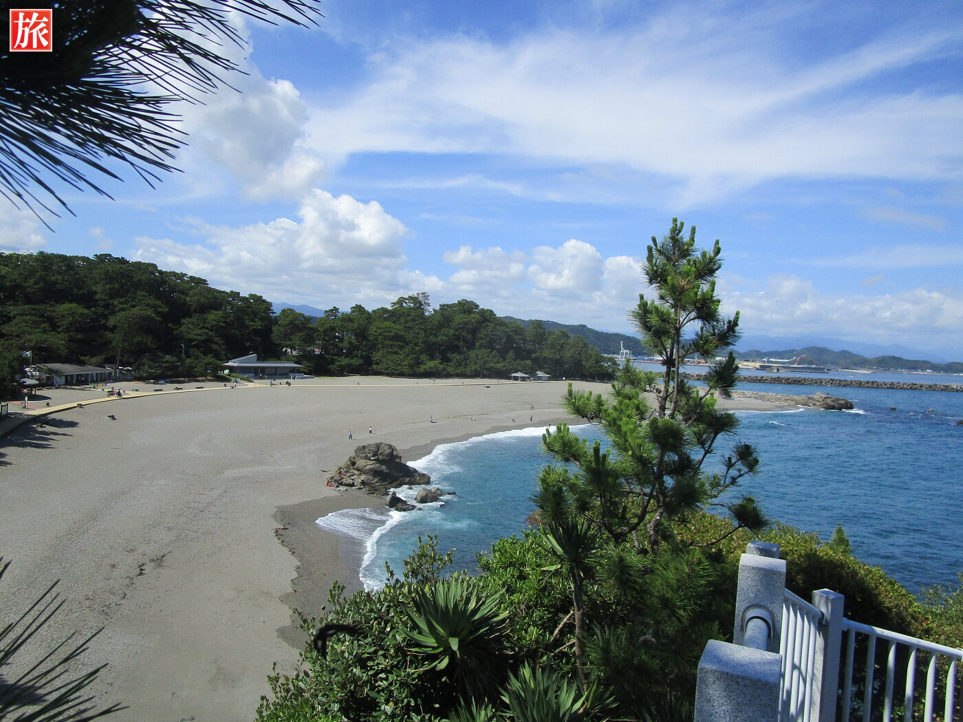 桂浜は龍頭岬と竜王岬の間に広がる弓状の砂浜。青い海と海岸に広がる五色の石、背後に広がる松が調和する景勝地。