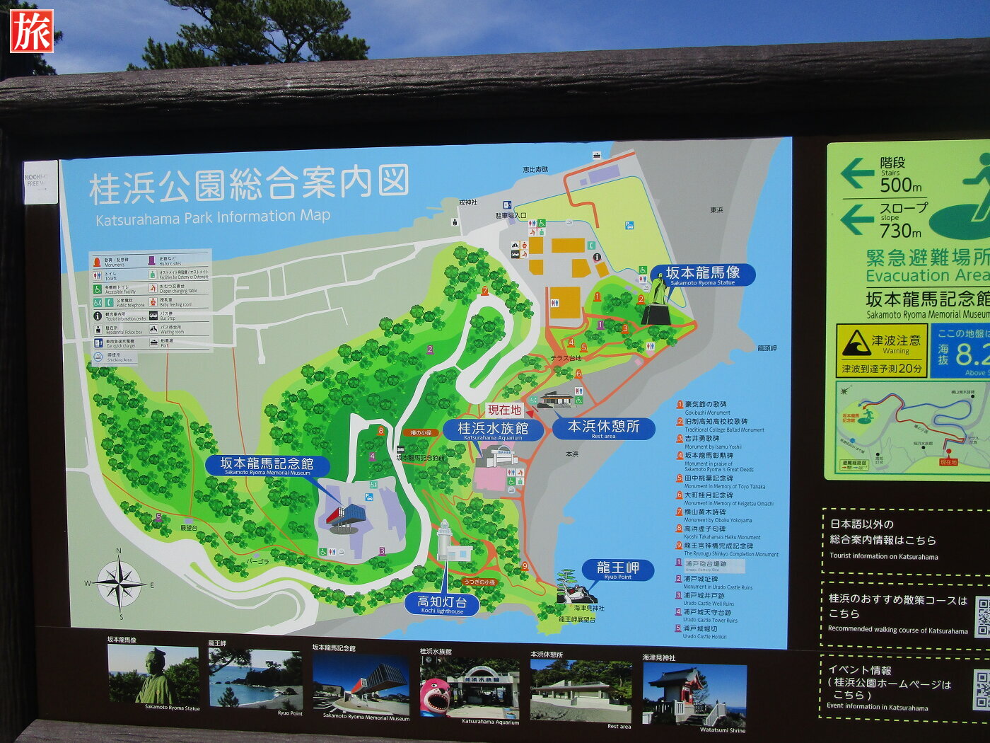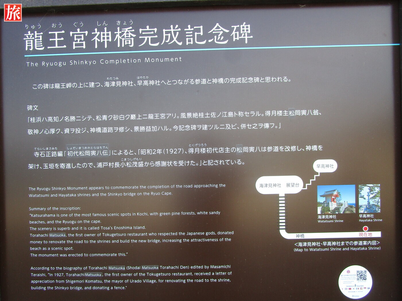 桂浜公園総合案内図。龍王宮神橋完成記念碑案内版。