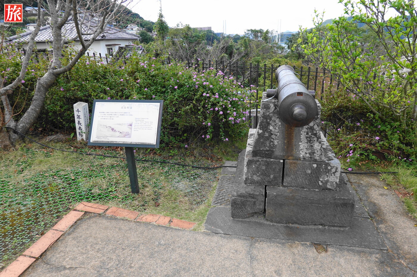 動く歩道2号機からの海の景色。旧三菱第二ドックハウスの近くにある高島流和砲(高島秋帆の指導で鉄砲鍛冶の野川清造が作成)