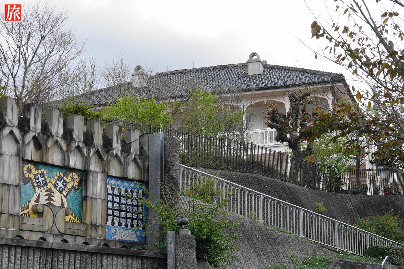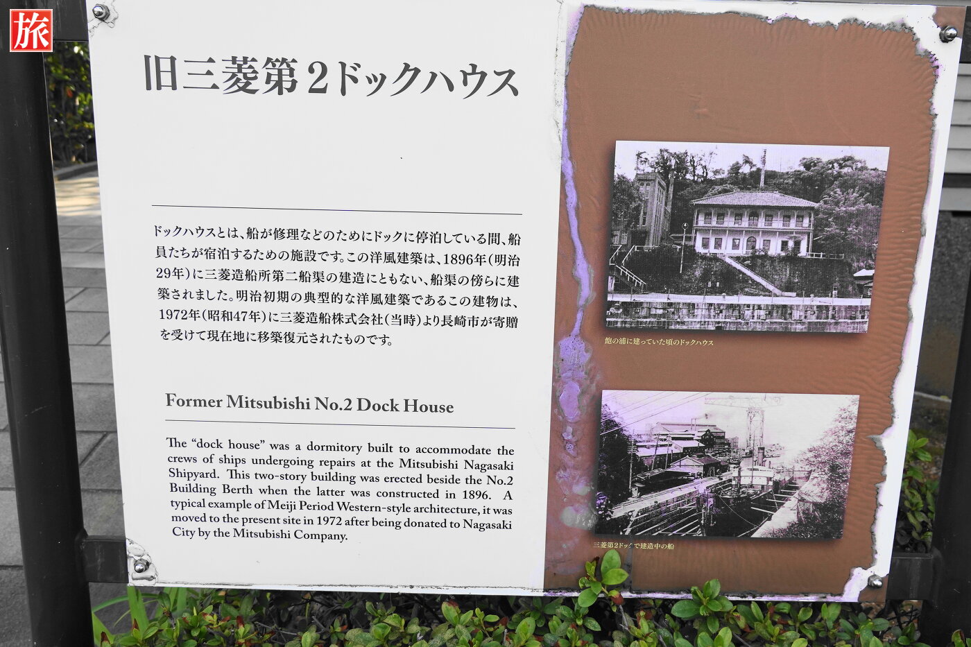 旧三菱第2ドックハウス。園内で最も高いところにあり。1896年(明治29年)に、三菱重工業長崎造船所第2ドック(飽の浦町)の傍に船員の休憩宿泊施設として建てられた建物。