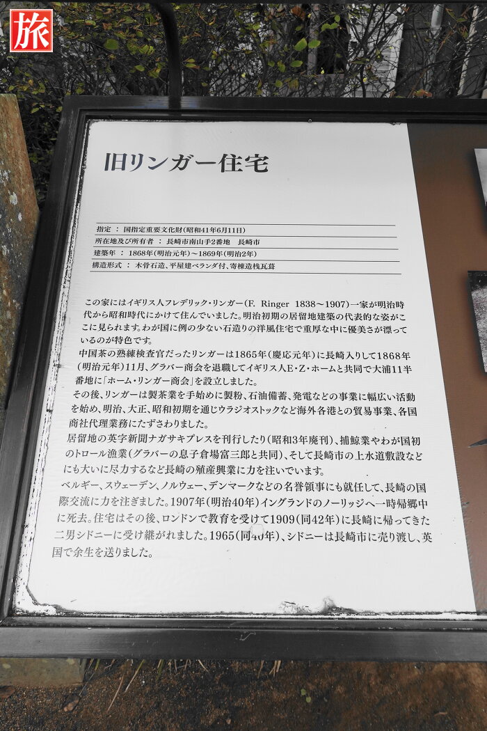 次は旧リンガー住宅。居住者のフレデリック・リンガーはグラバー商会の幹部として元治元年(1864年)頃に長崎に来訪。1940年の閉鎖までの約70年間、外国貿易や商社代理店、お茶の加工、ガス等幅広い事業に従事。