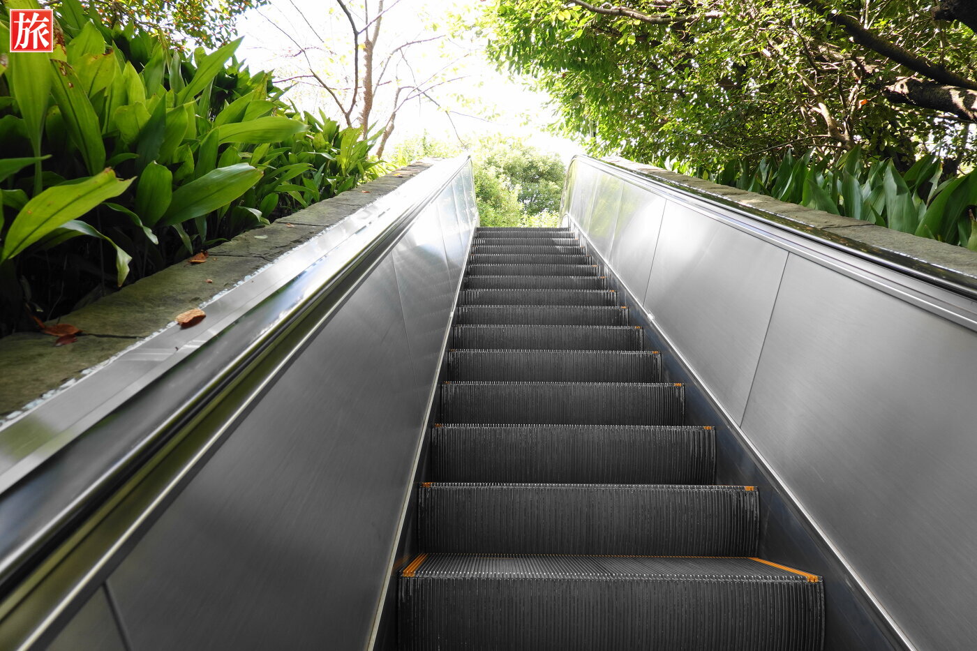 第一ゲート料金所付近にある白いボックスの公衆電話。動く歩道で景色を見ながら移動。坂が多く動く歩道やエスカレーターがあるのが便利でした。