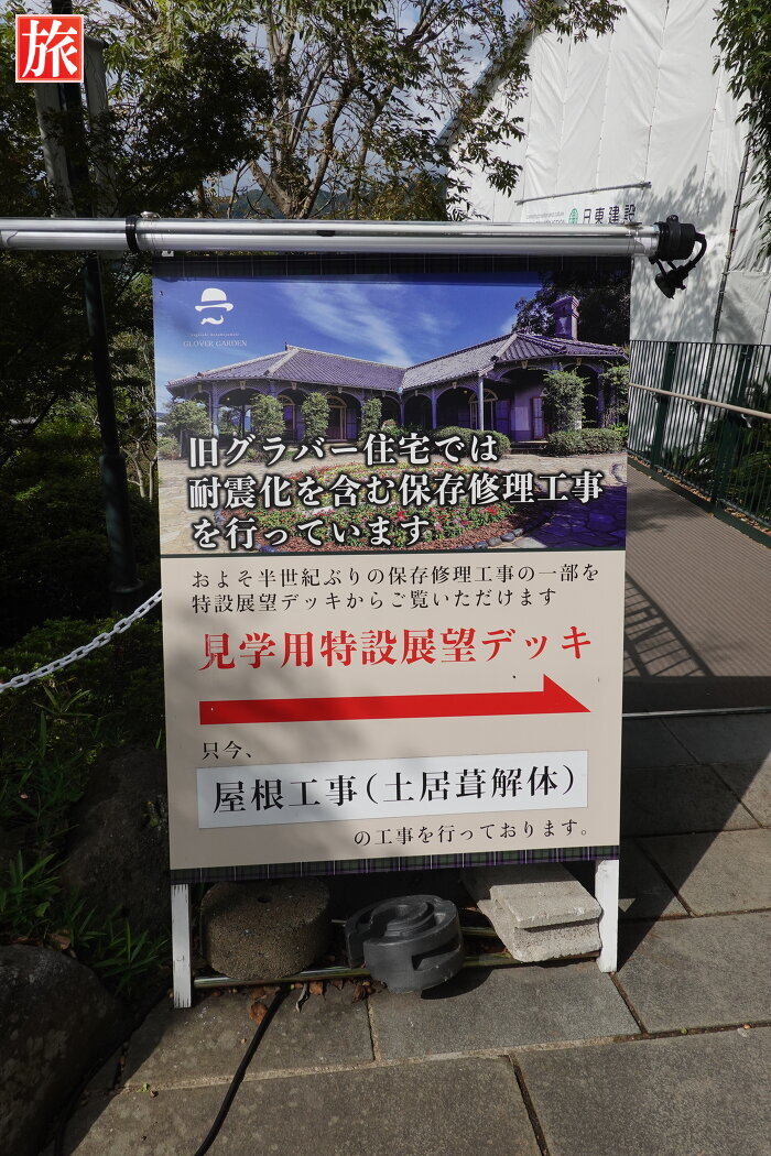 あいにく旧グラバー住宅は保存修理工事中で、見学用特設デッキが設けてあり外観のみ見学できます。