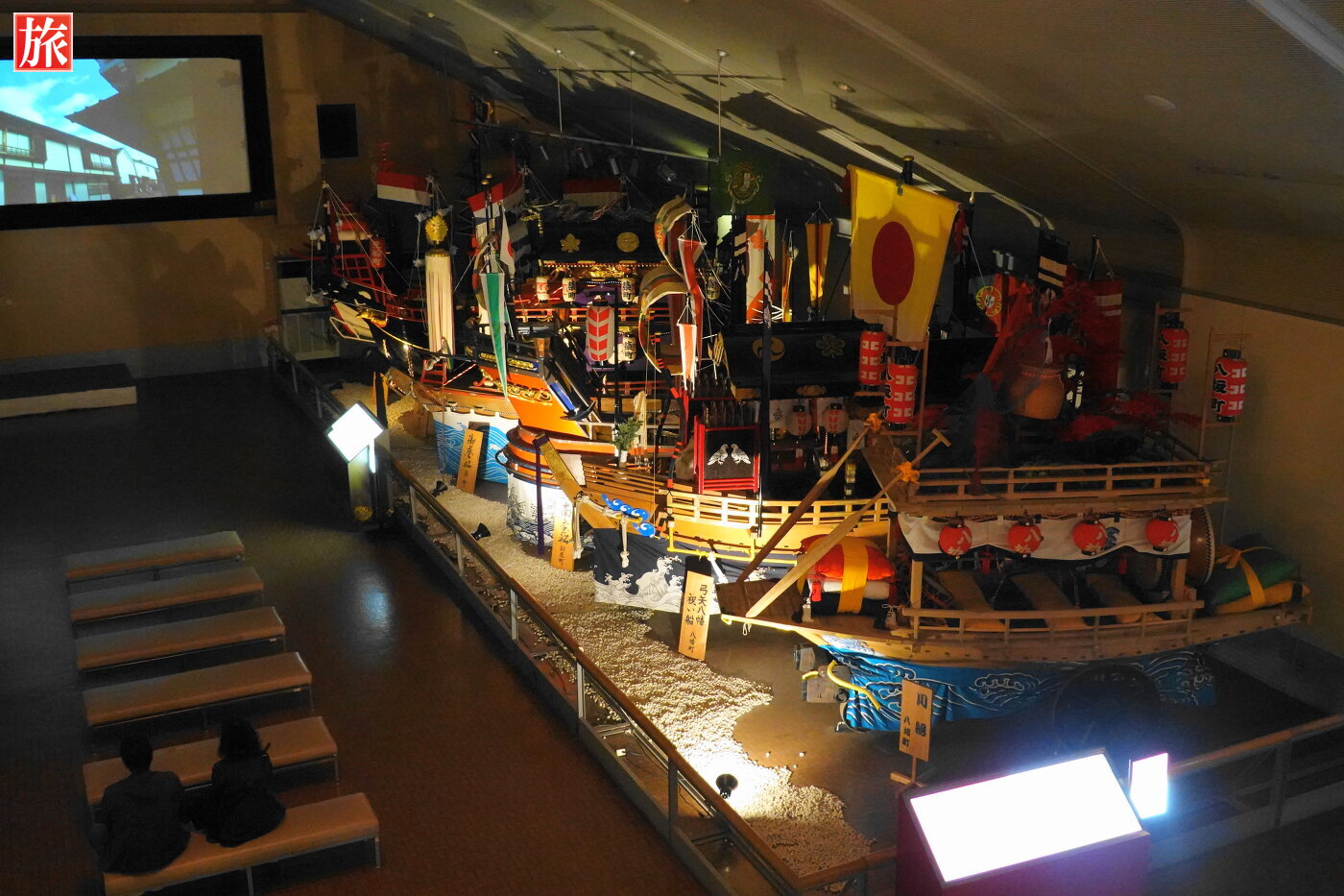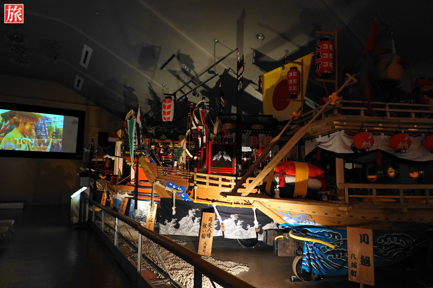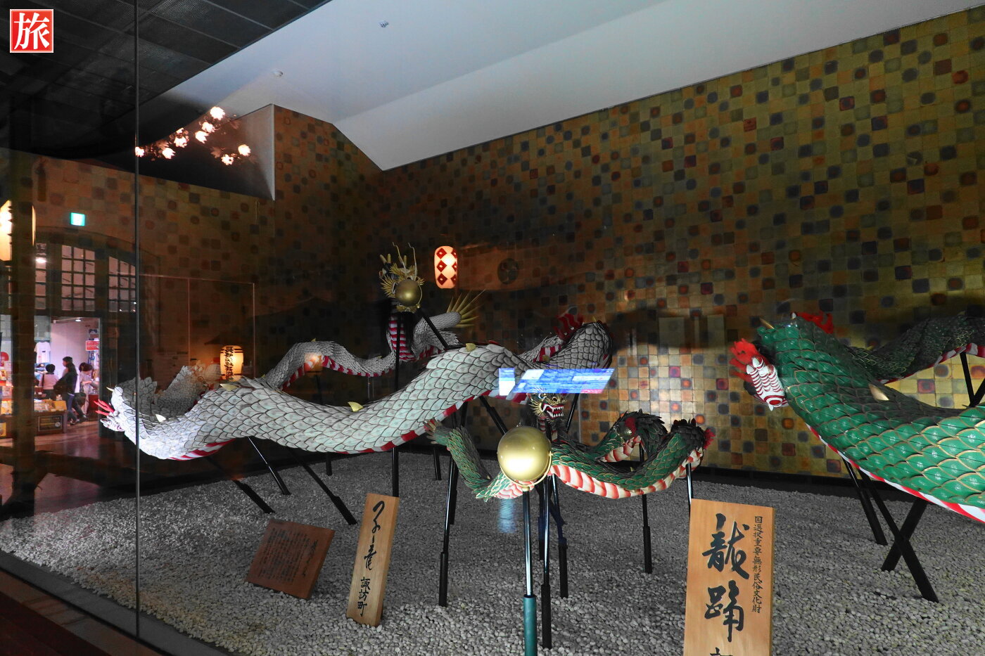 長崎伝統芸能館。長崎のお祭り「長崎くんち」に奉納される龍踊りの白龍、青龍、各町の奉納踊りを先導する「傘鉾(かさぼこ)」と呼ばれる豪華な飾りなどが展示されています。