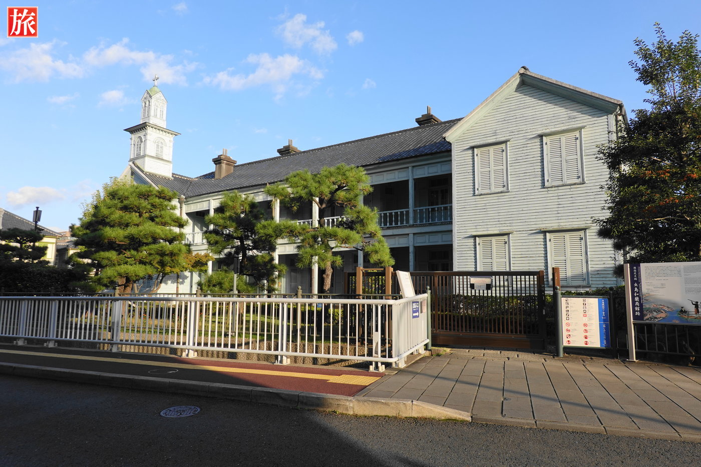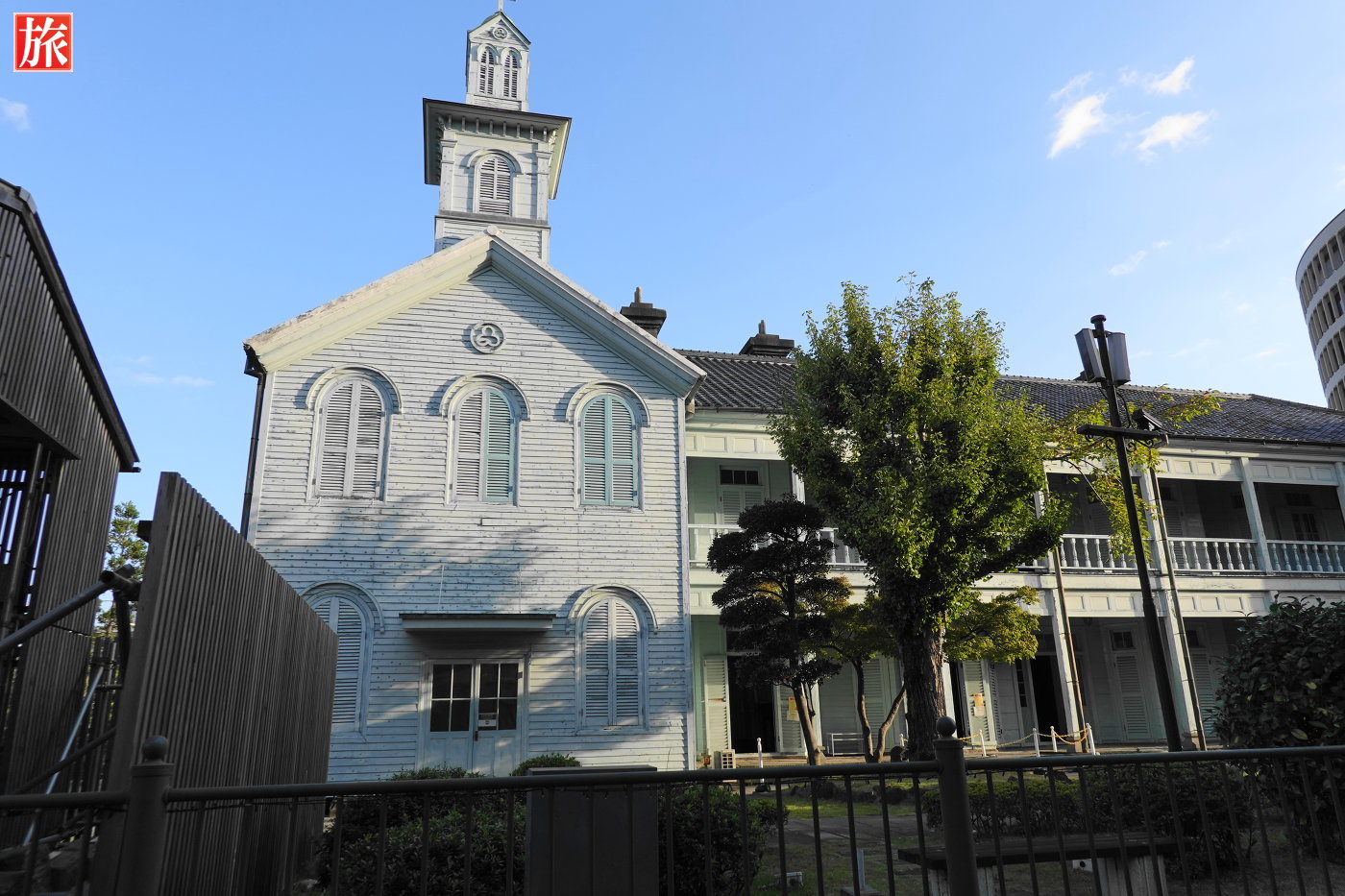東側・明治ゲート付近。出島資料館本館(旧出島神学校)明治初期に建てられた、現存するわが国最古のキリスト教(日本聖公会)の神学校。現在は、出島史料館本館として開館されています。