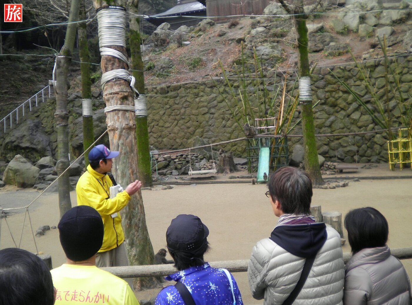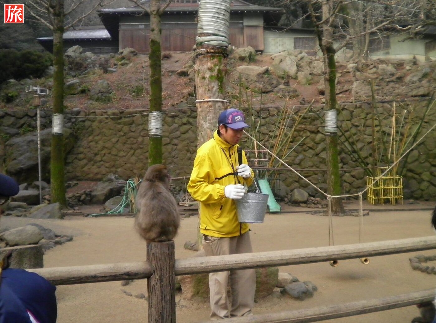 係員さんによる餌まきが始まります。どこからともなく多くのお猿さん達が係員さんのところへ、、