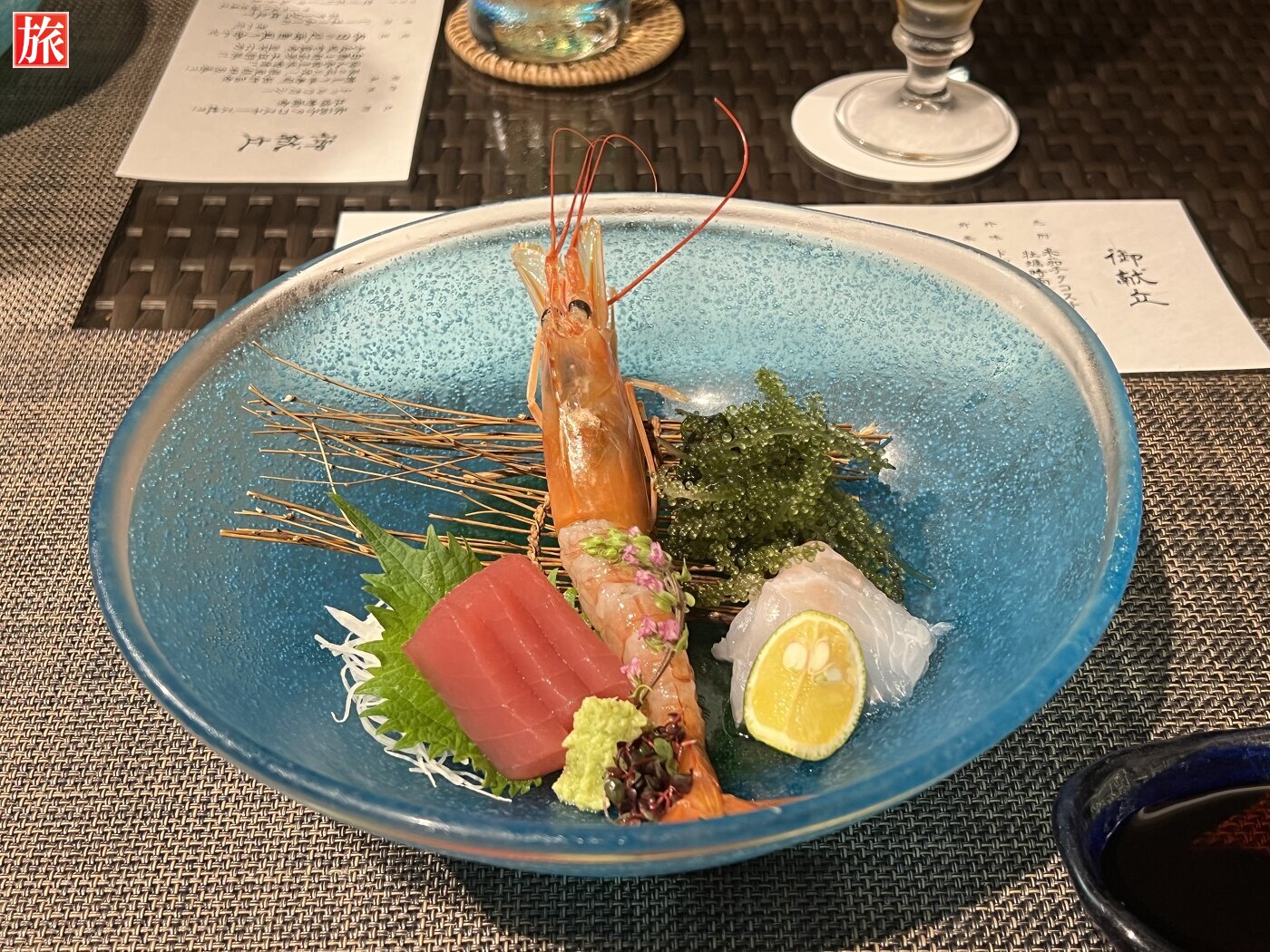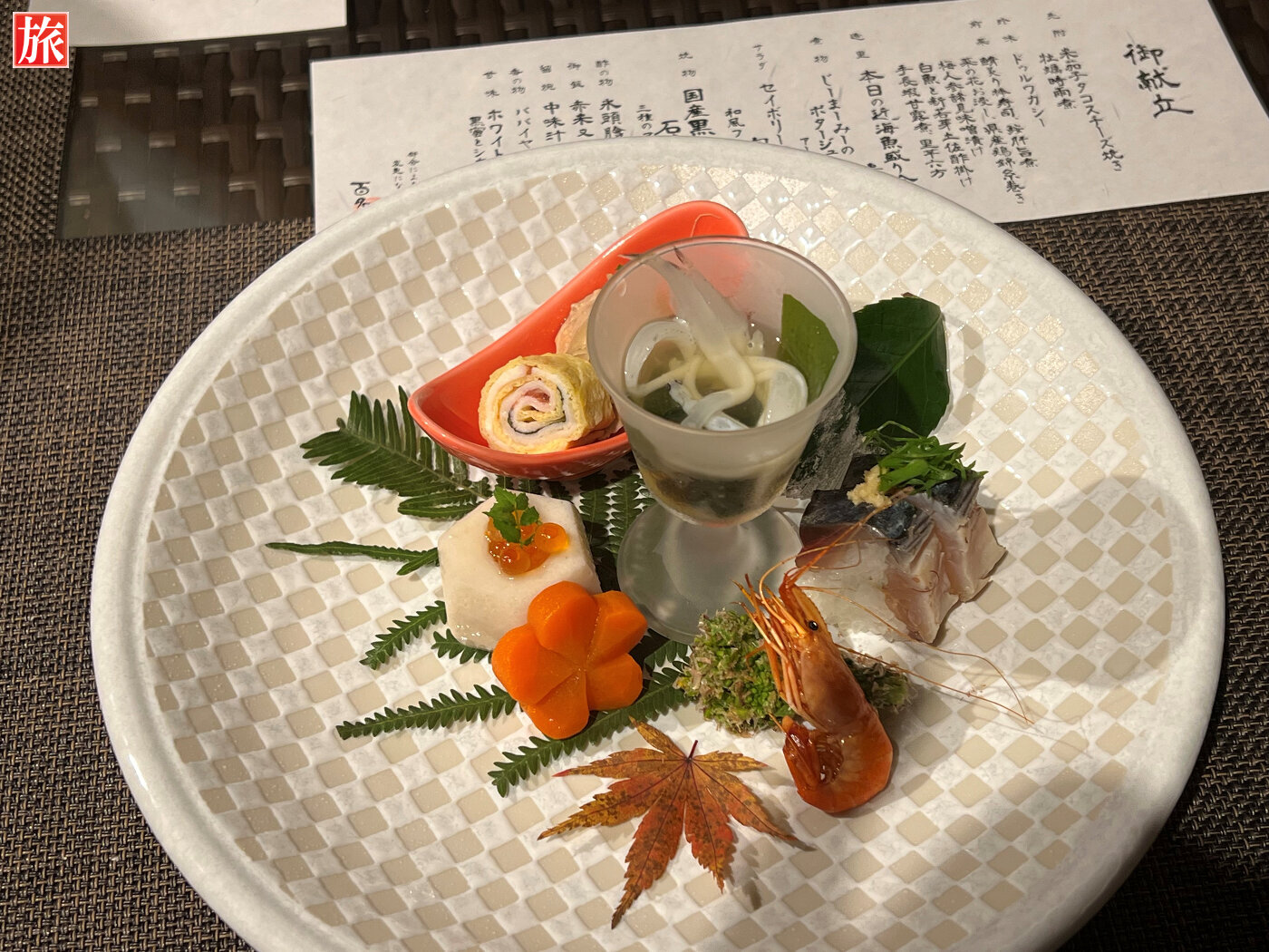 夕食 献立 先付け(米茄子タコスチーズ焼き・牡蠣時雨煮)珍味(ドゥルワカシー)前菜(鯖炙り棒寿司、手長蝦甘露煮、里芋六方、菜の花お浸し、白魚と新若芽土佐酢掛け等)造里(近海魚盛り合わせ)