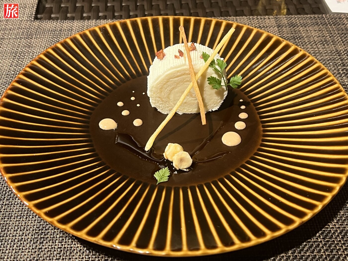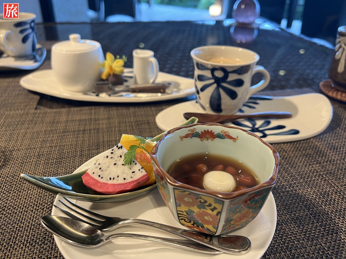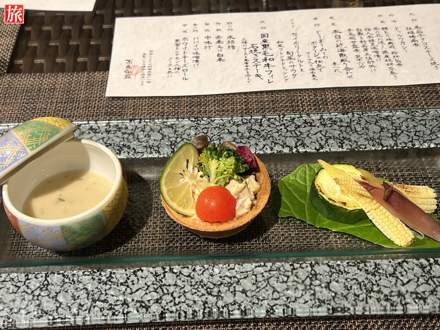 夕食 煮物(じーまーみーのポタージュ仕立て)サラダ(セイボリータルトと旬菜のサラダ)焼物(国産黒毛和牛フィレ石焼ステーキ)酢の物(氷頭膾)御飯(赤米又は白米)留椀(中味汁)香の物(パパイヤ味噌漬け)甘味(ホワイトチーズロール、黒蜜とシナモン二種ソース添え)