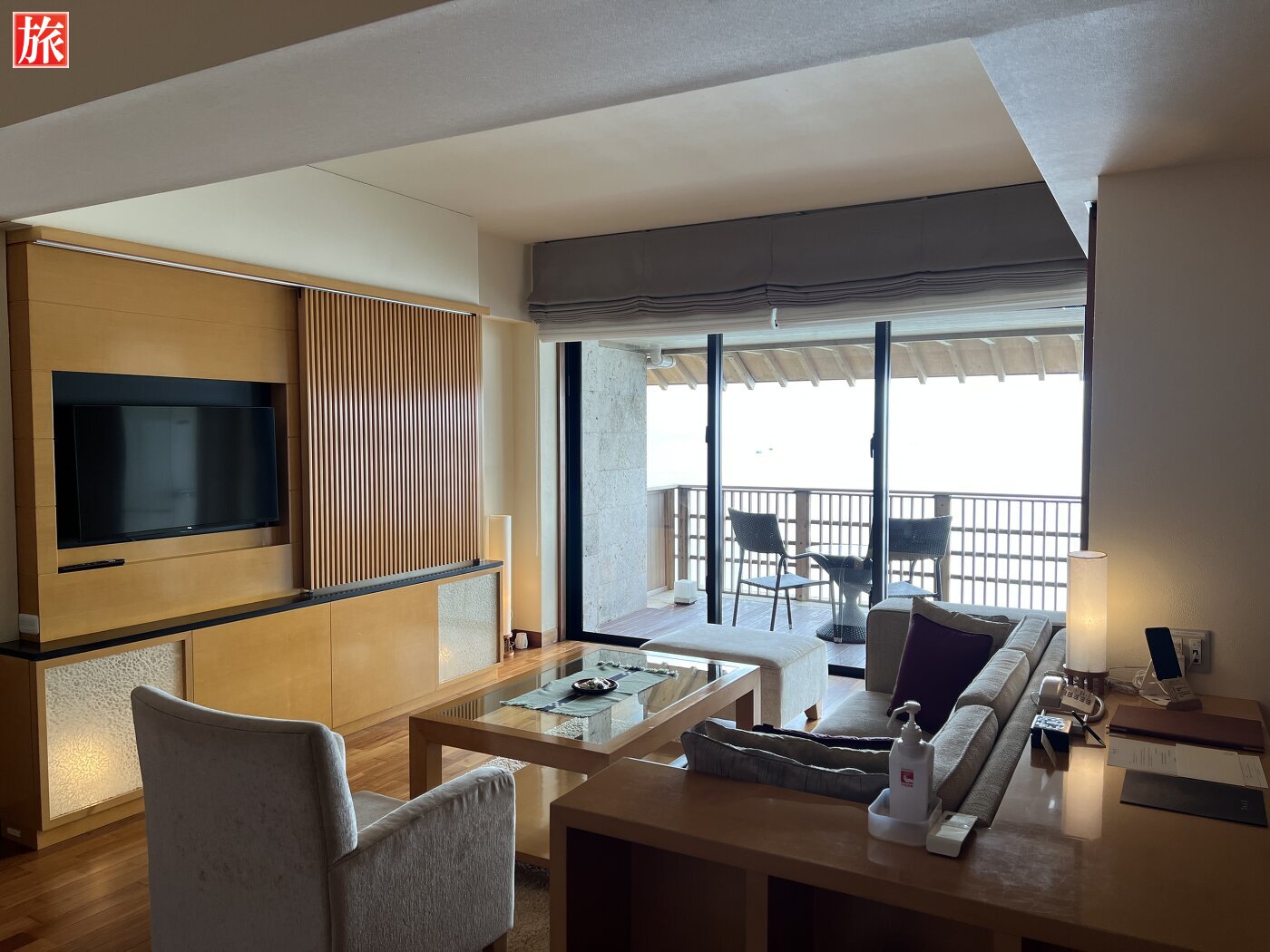 外観。ウエルカムドリンク。エグゼクティブスイート内部屋の様子。