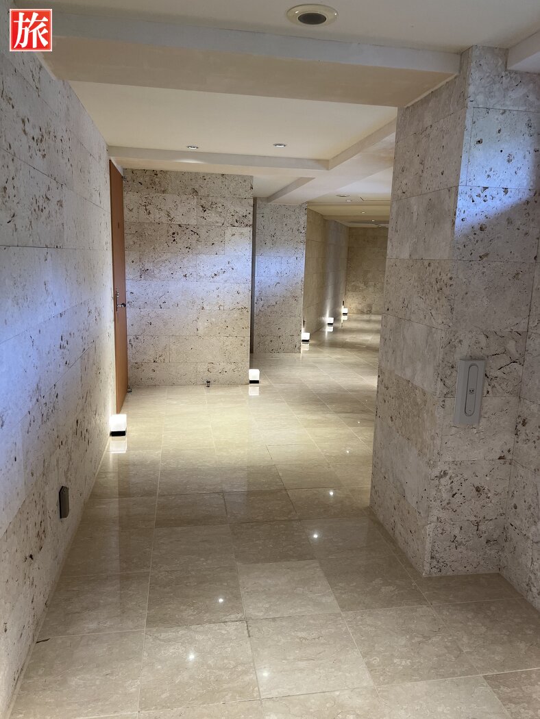 館内の様子。壁と廊下の調和が高級感を醸し出す。自了館(1F)。中庭「小さな森」