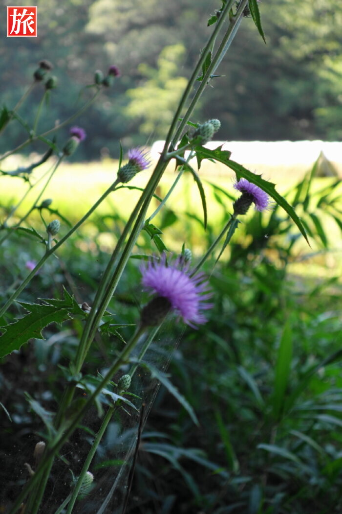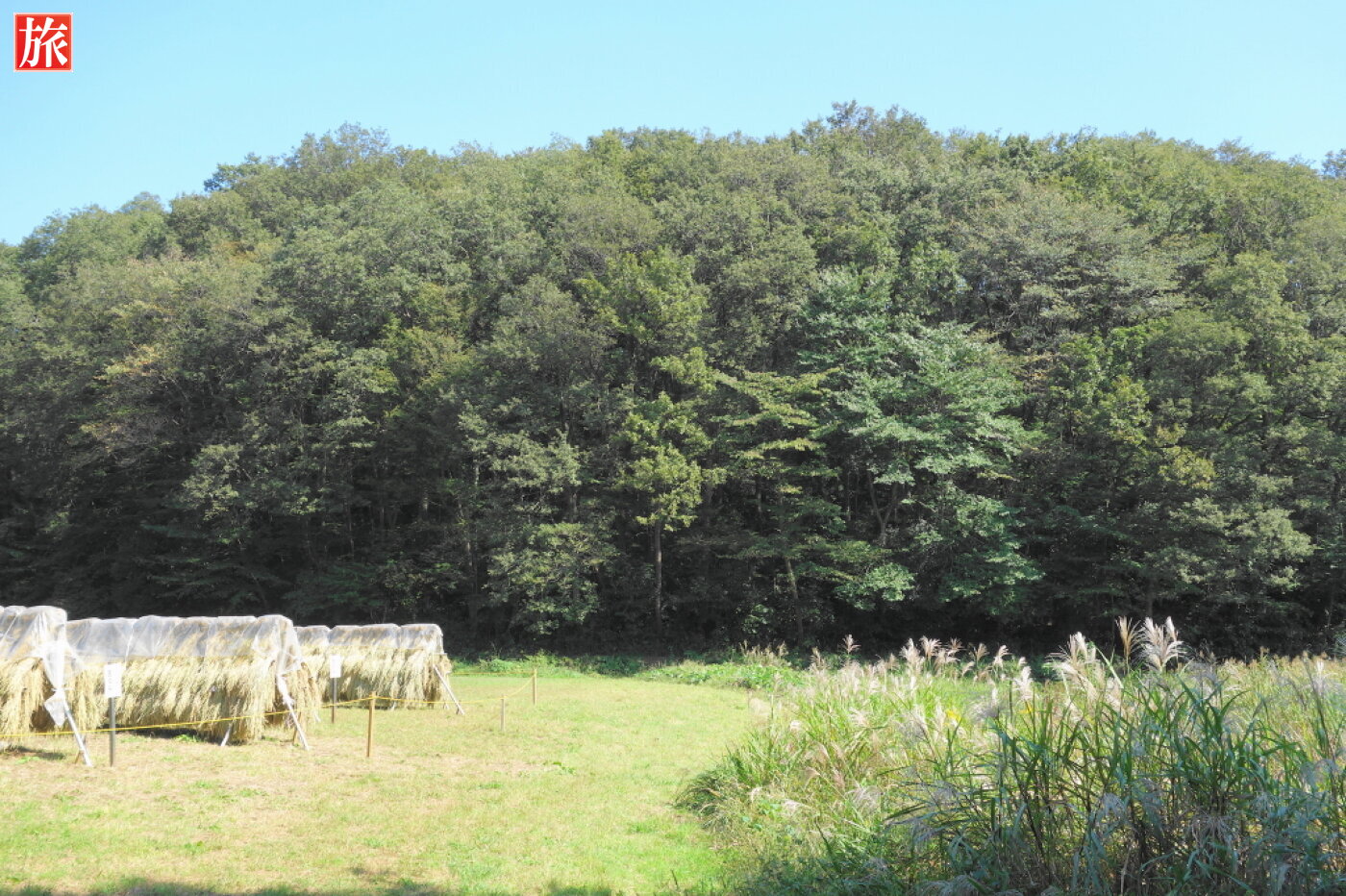 刈られた後の岸田んぼ。ノハラアザミ。東の森方向から西の森と天日干しされている稲を見た様子。宮野入東の森の看板。