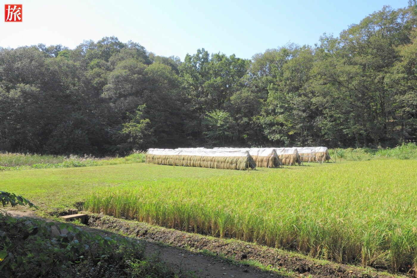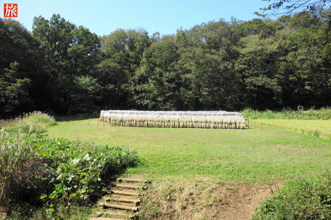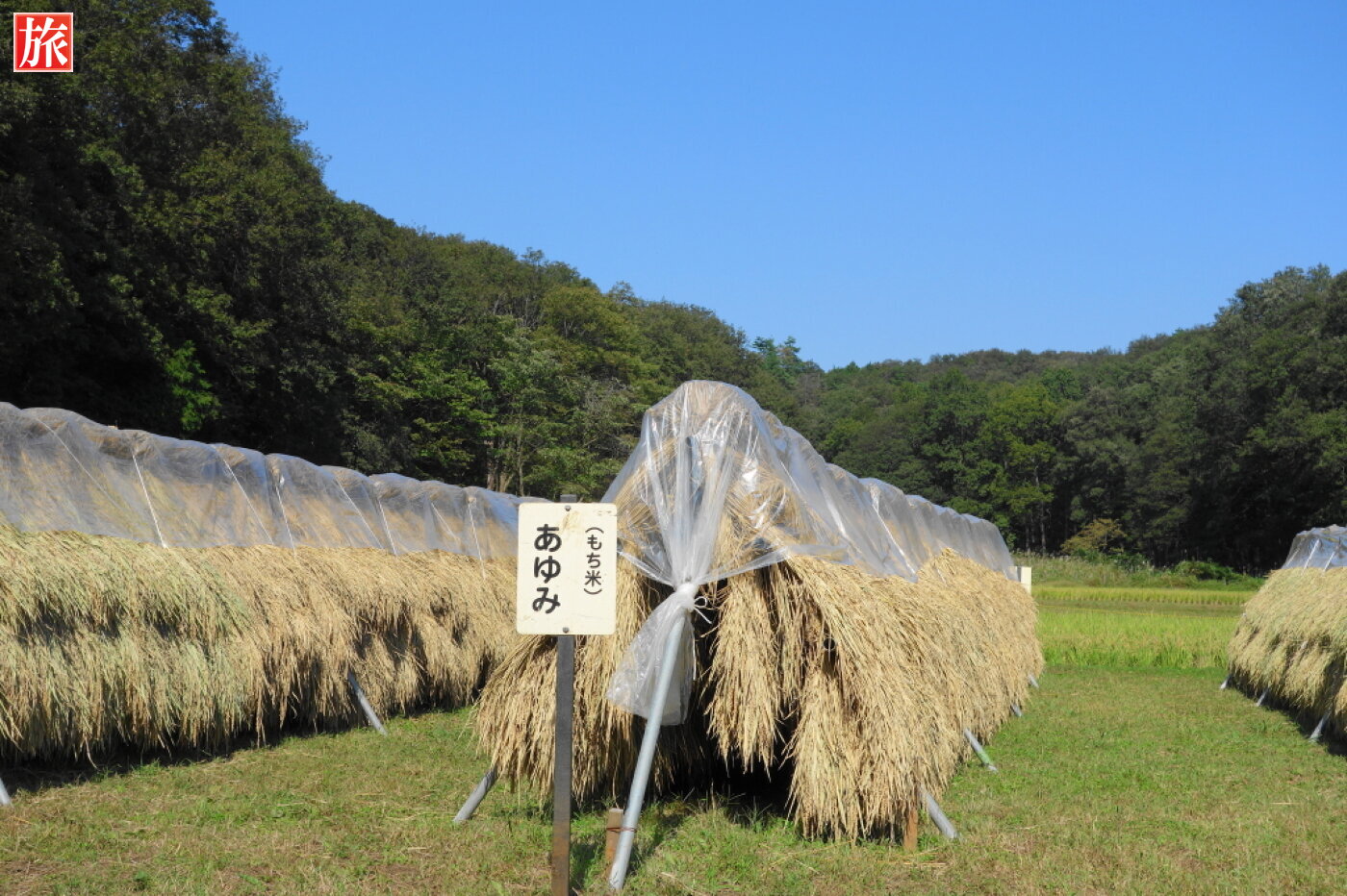 里山民家近くで天日干しされている稲。12日特別コーナーとして雑木林体験コーナーがありました。