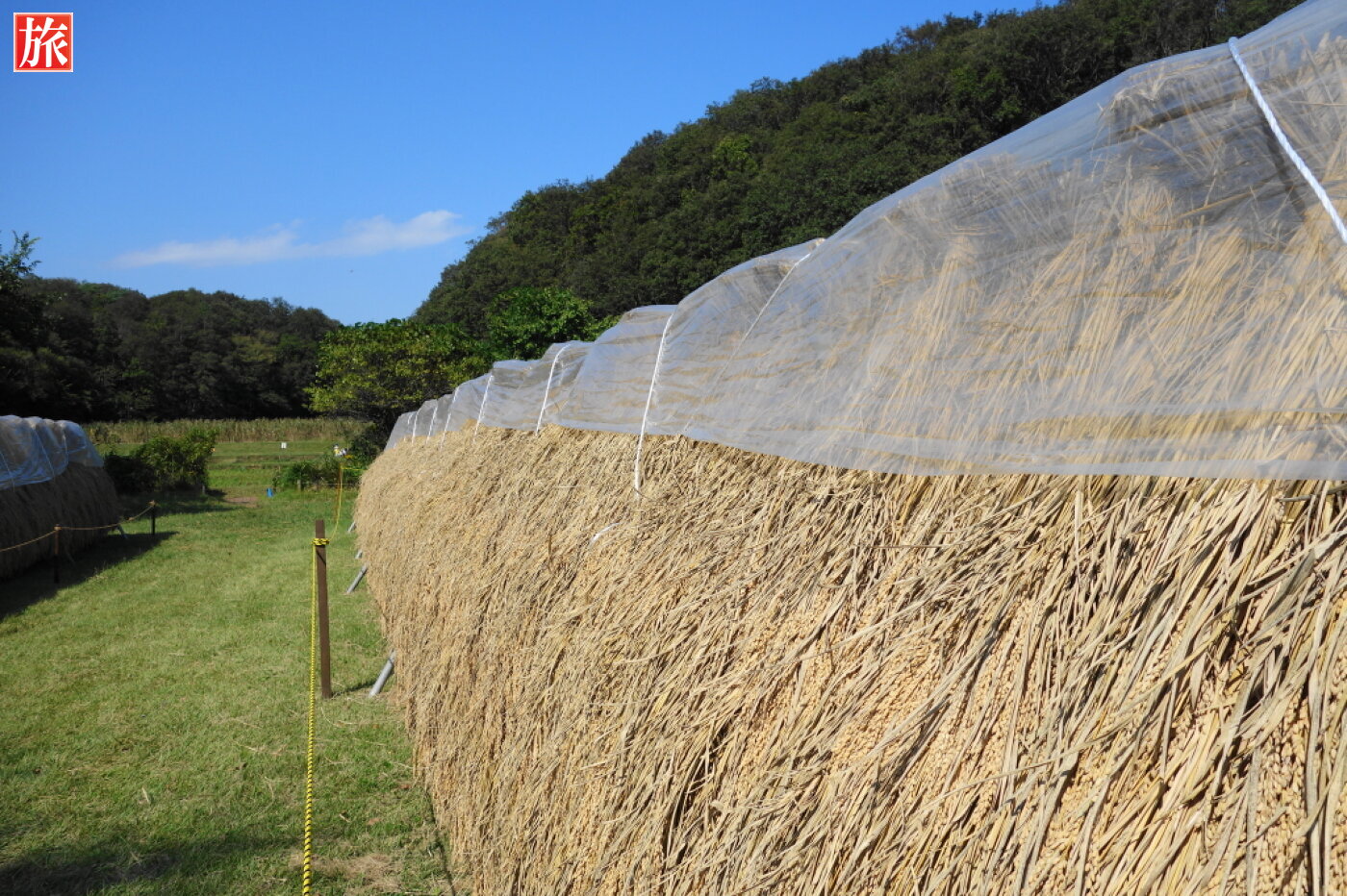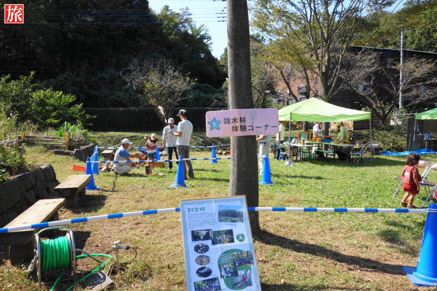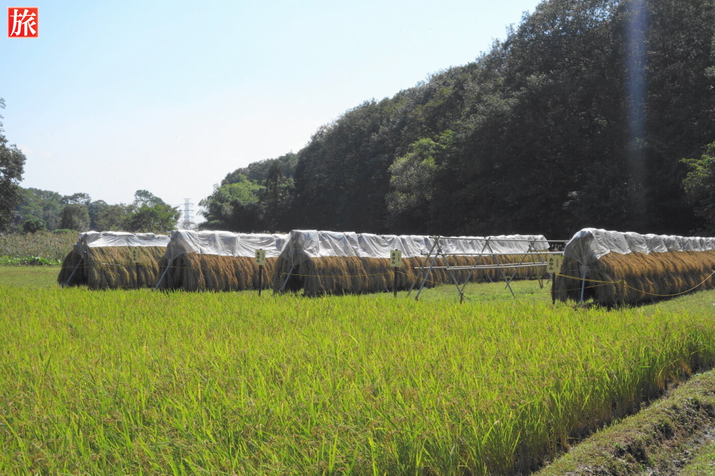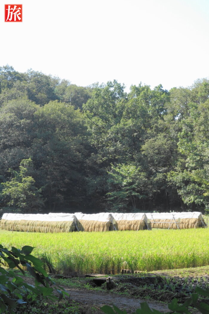 里山民家近くで天日干しされている稲。12日特別コーナーとして雑木林体験コーナーがありました。