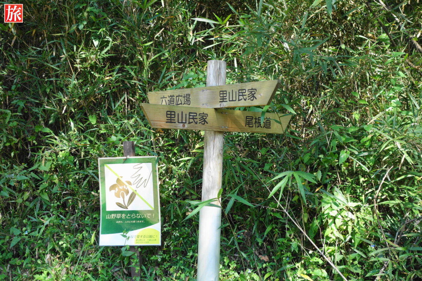 岸田んぼの東側の道を進むと分岐の案内板が現れます。尾根道方向。里山民家方向(西側)。里山民家方向(東側・戻る方向)。六道広場方向。