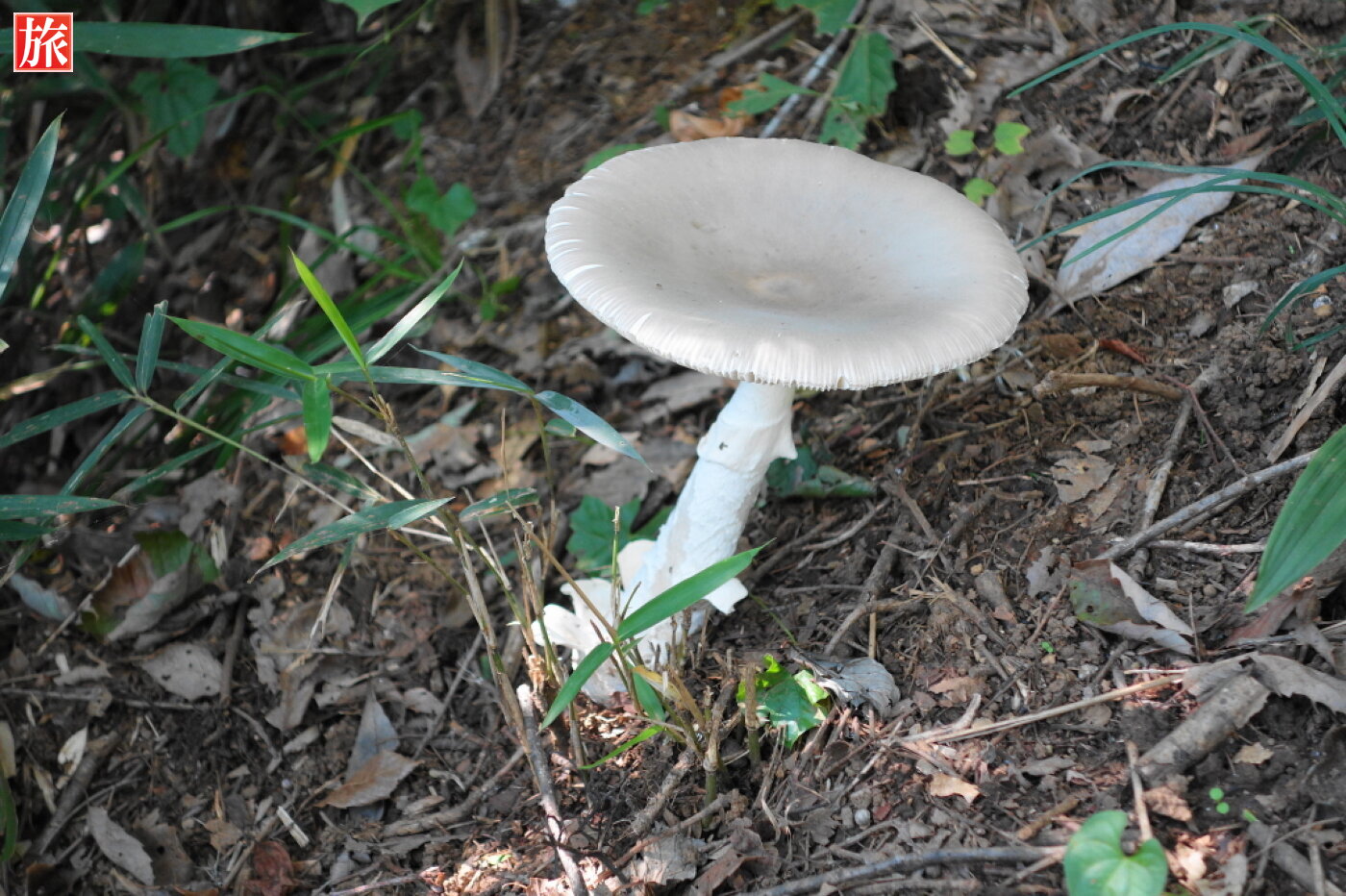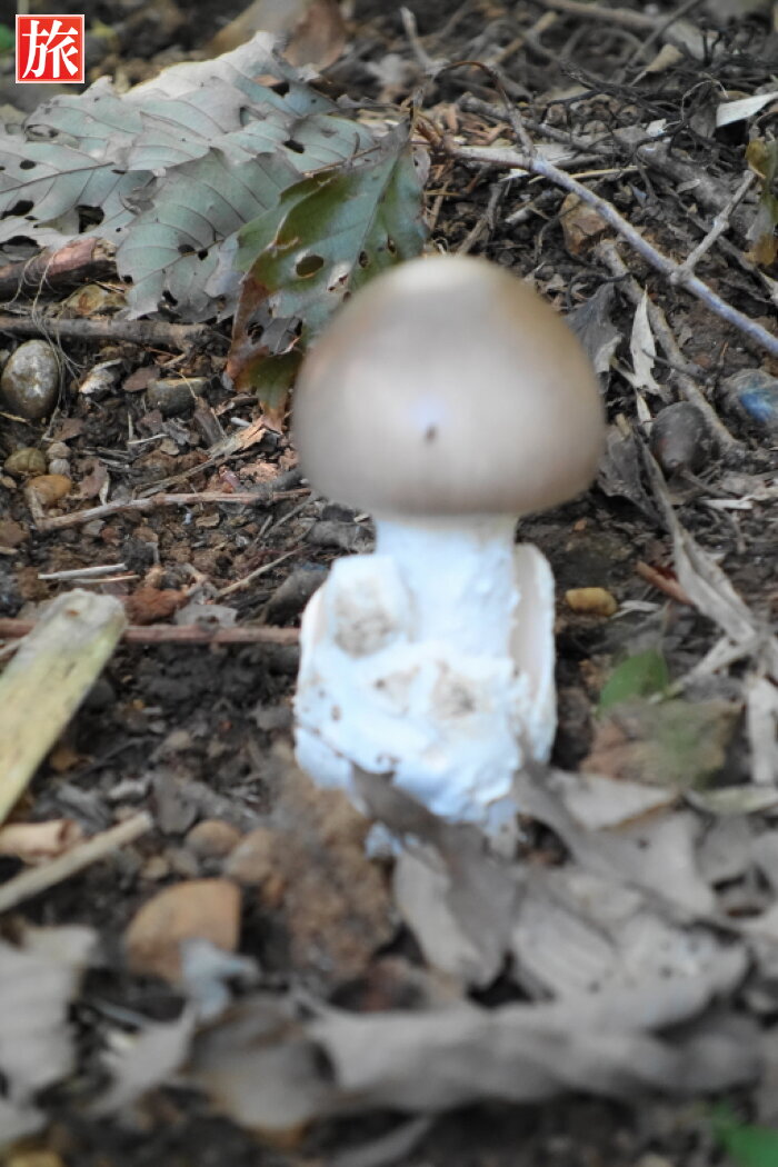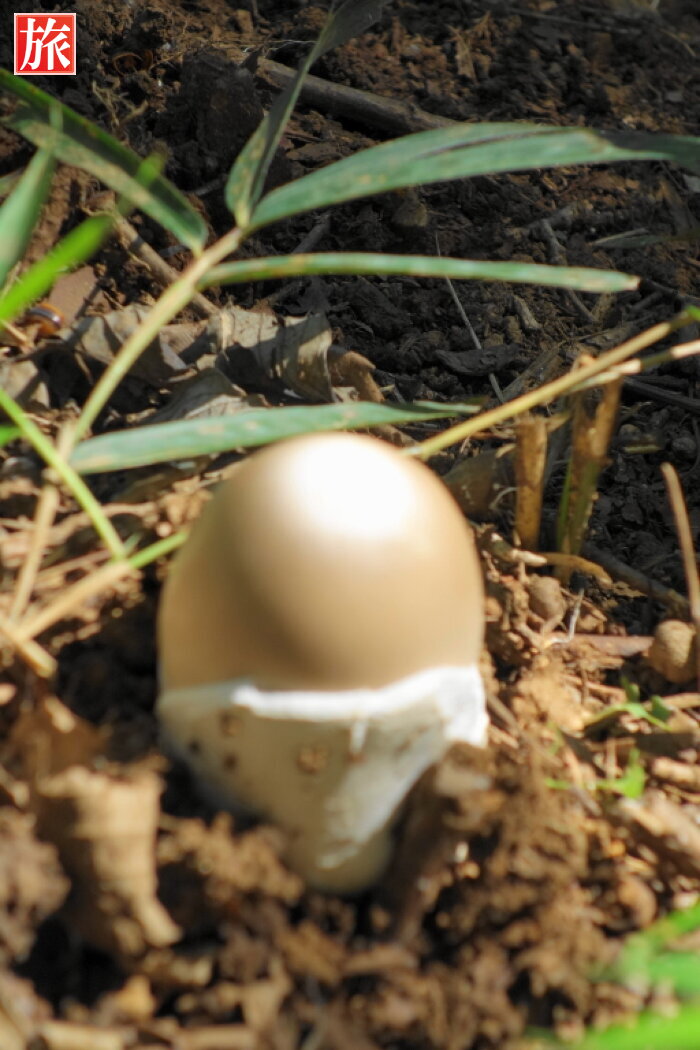 キノコを発見。金の卵の様に見えます。それがニョキッと伸び。立派なキノコへ変身。同じ種類のようです。