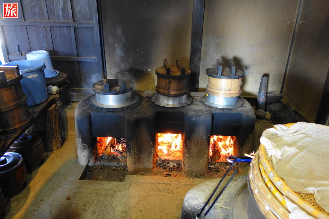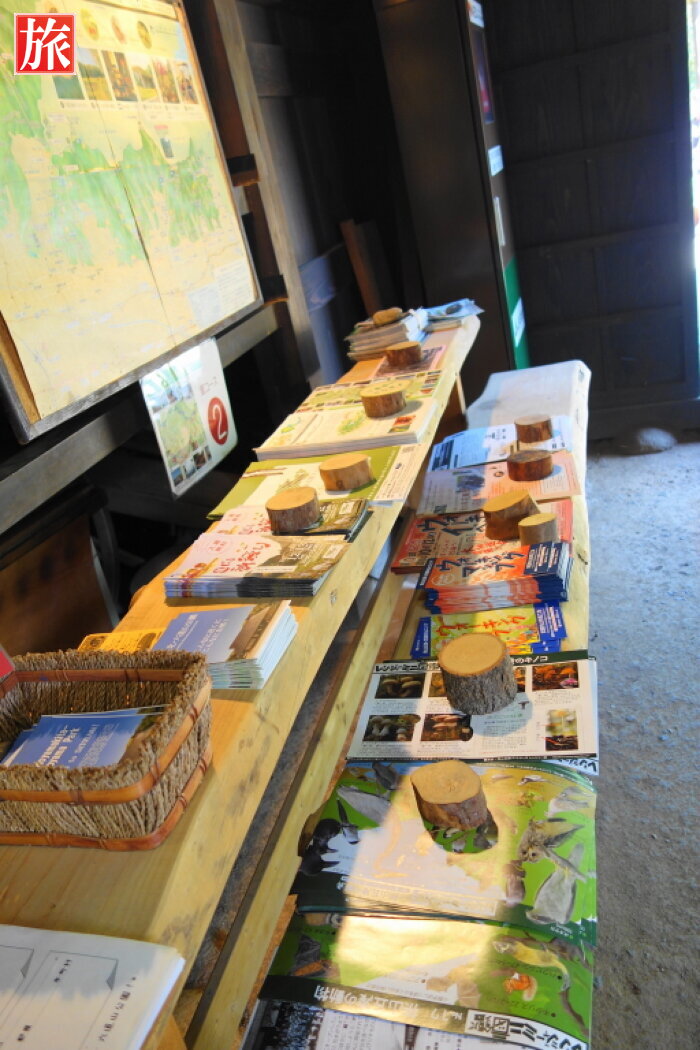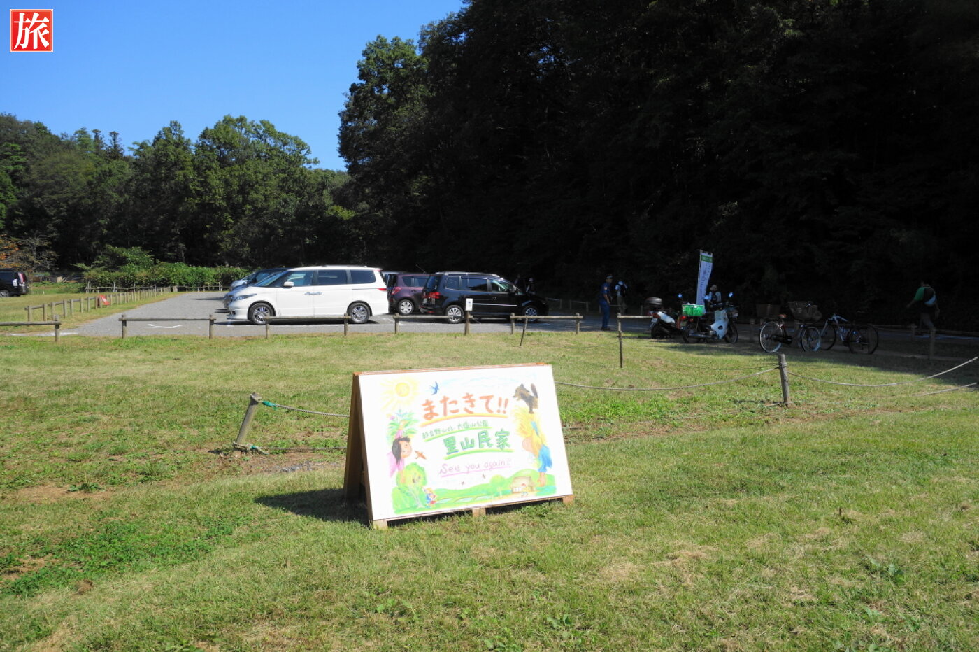 母屋内では、かまどで芋を蒸していました。パンフレット類が多数置かれています。里山民家から駐車場へ向かいます。
