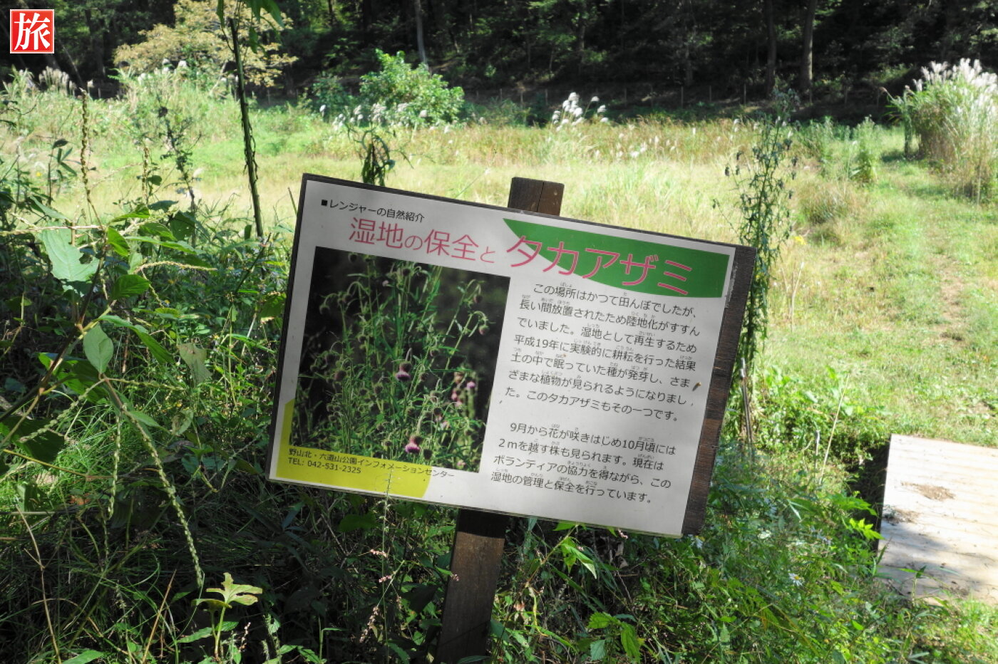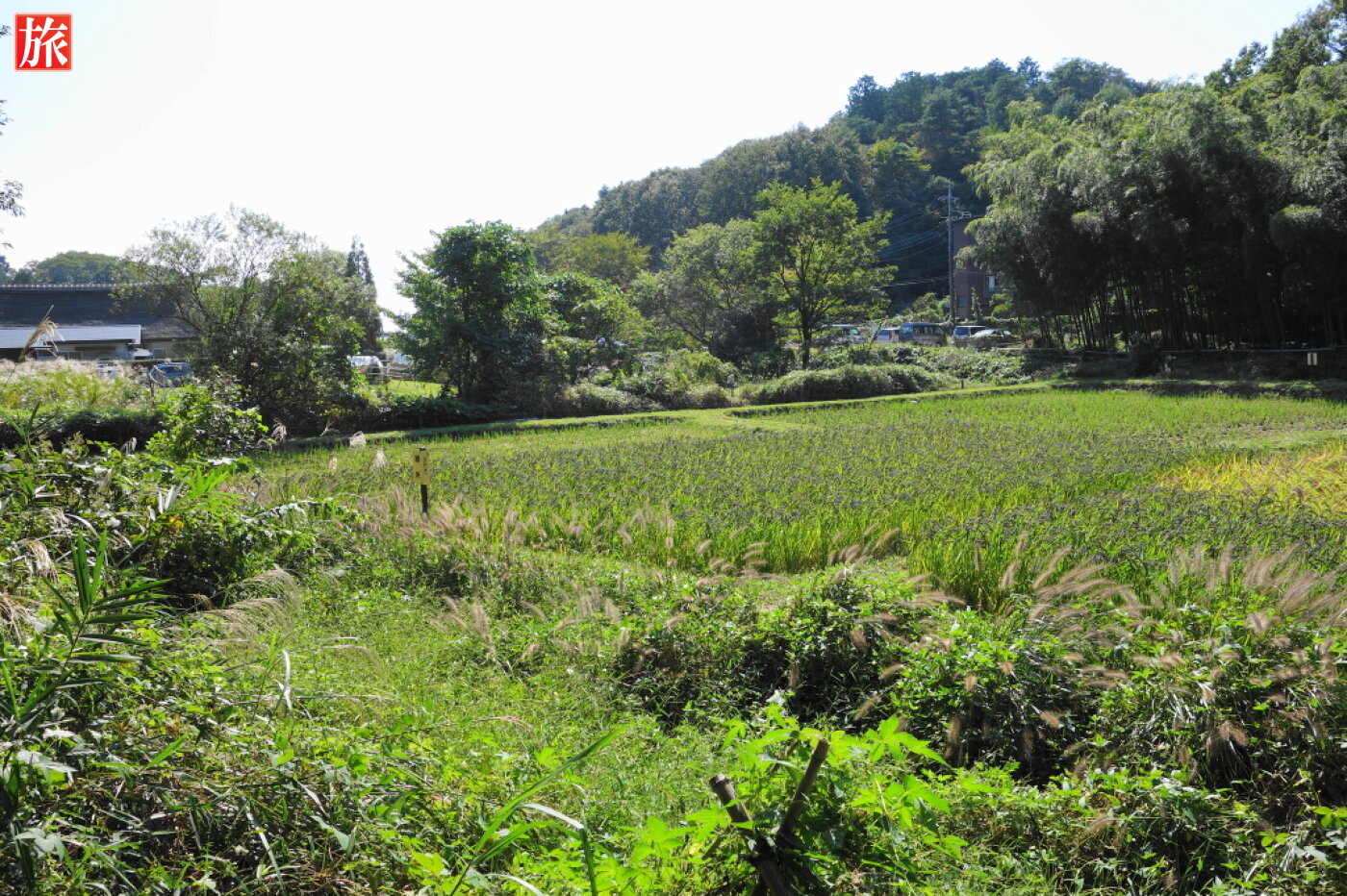 岸田んぼの一番奥です。タカアザミの説明板。岸田んぼの奥方向から民家を望む。