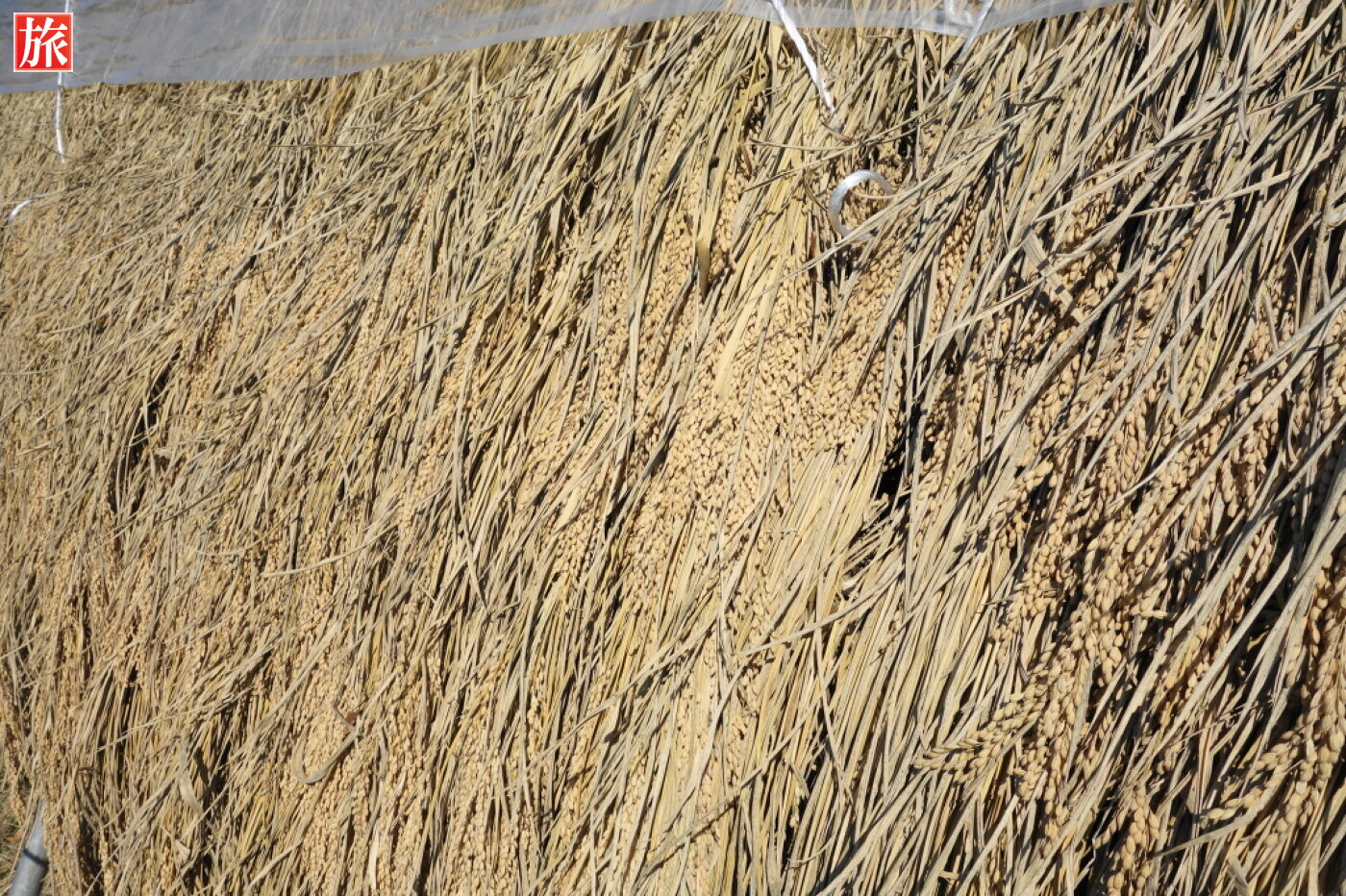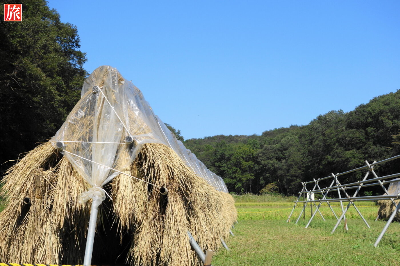 岸田んぼを一周するように西側から戻ります。西側から見た天日干しされている稲。干されている稲の近くまで行ってみました。