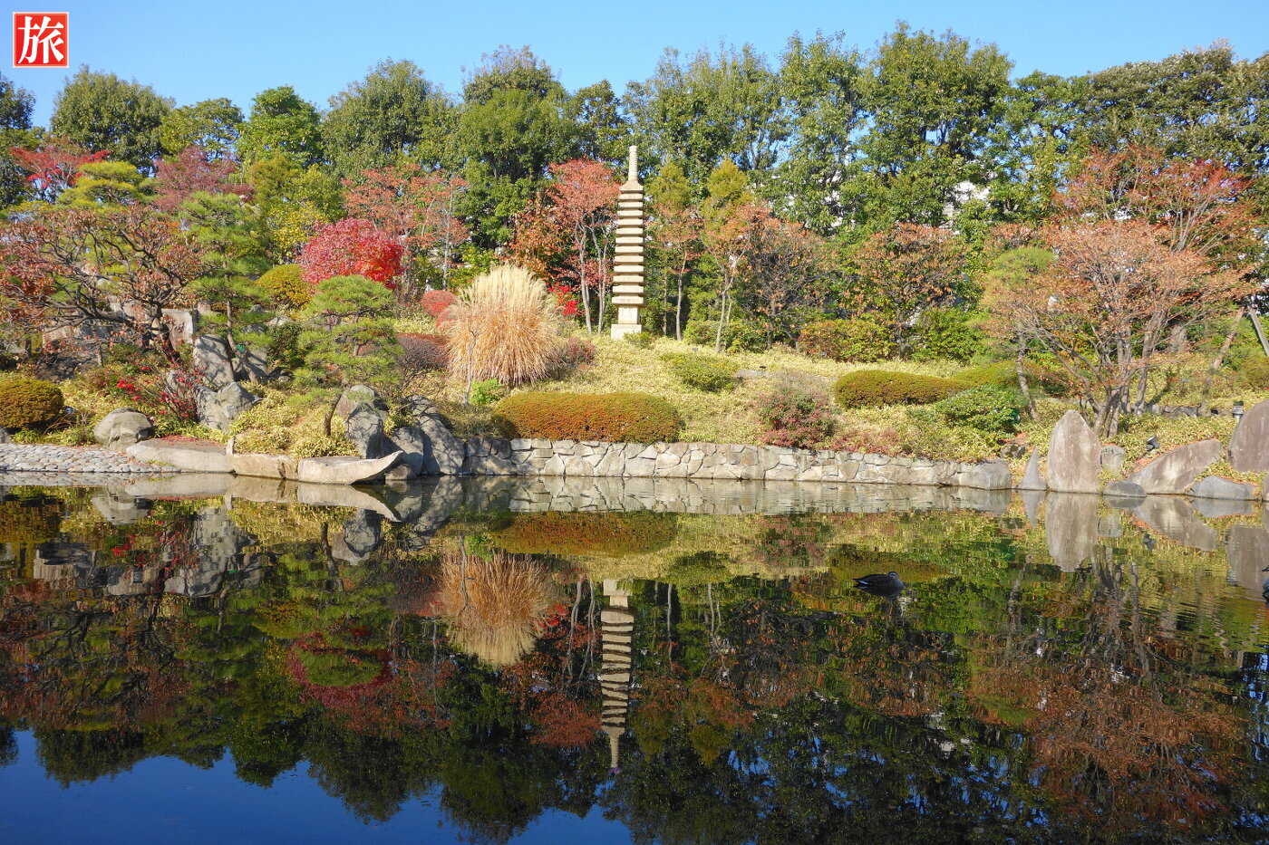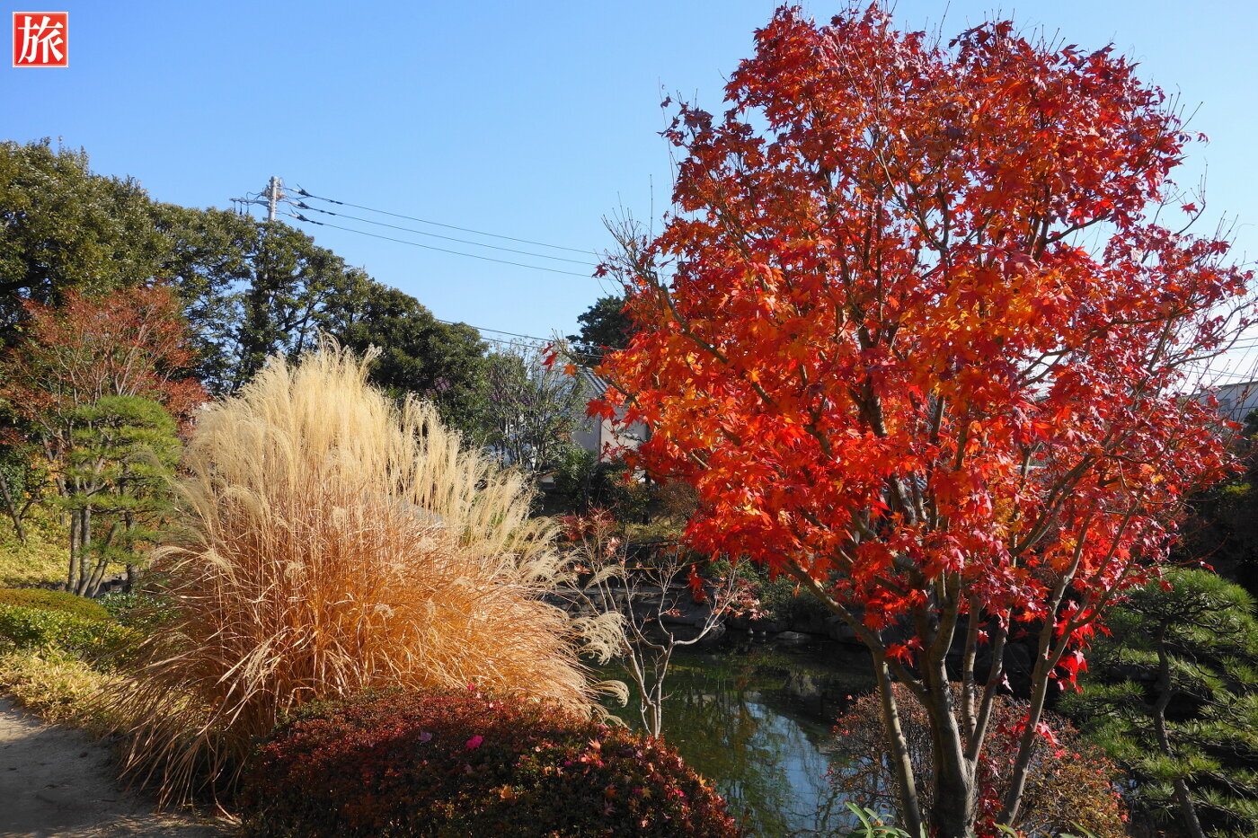 ススキ、青空と紅葉。向かい側から「赤鳥庵」を望む。六角浮き見堂から見た池。