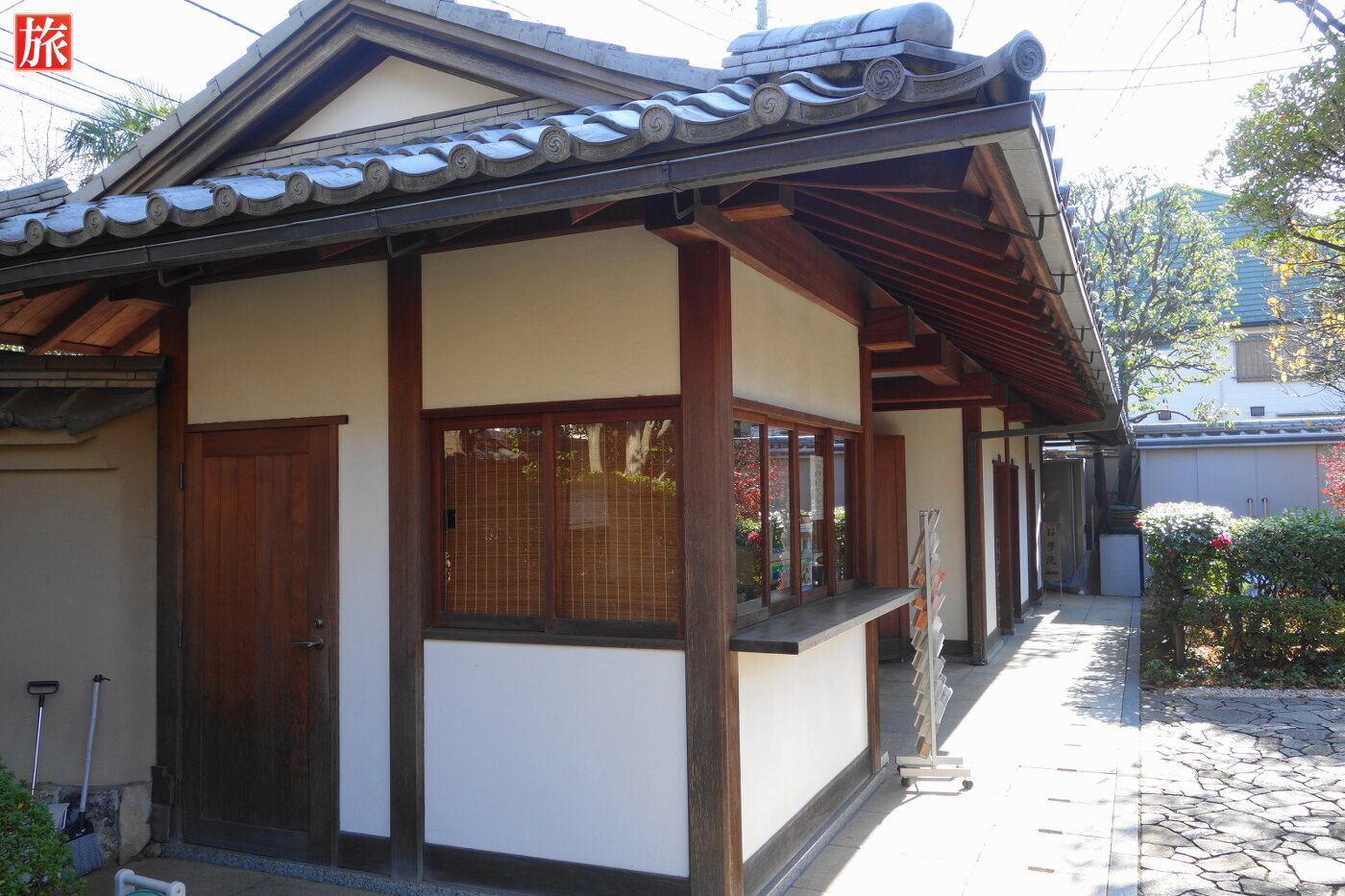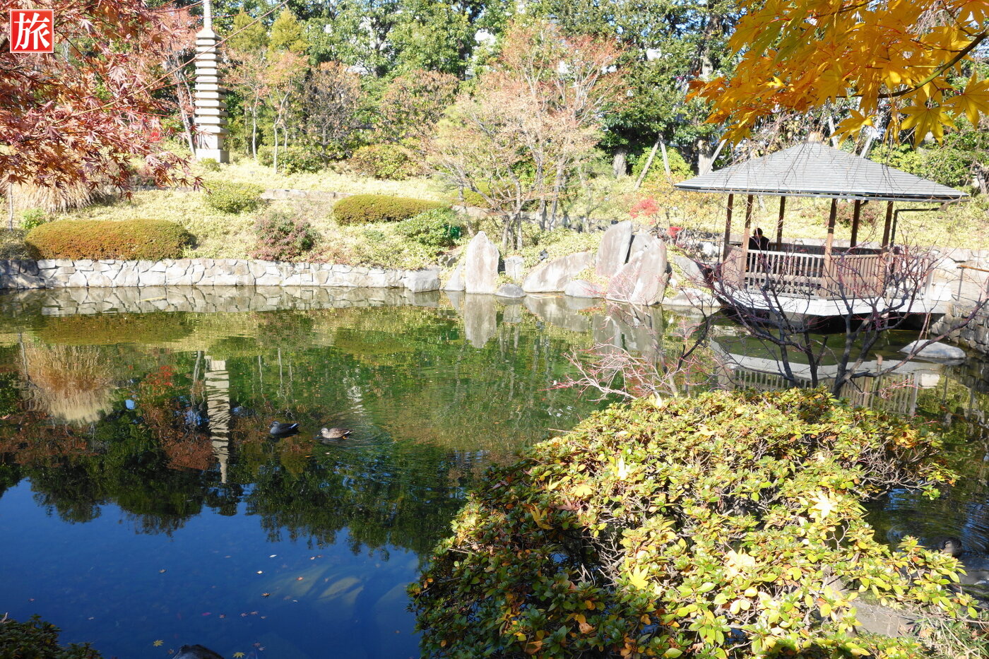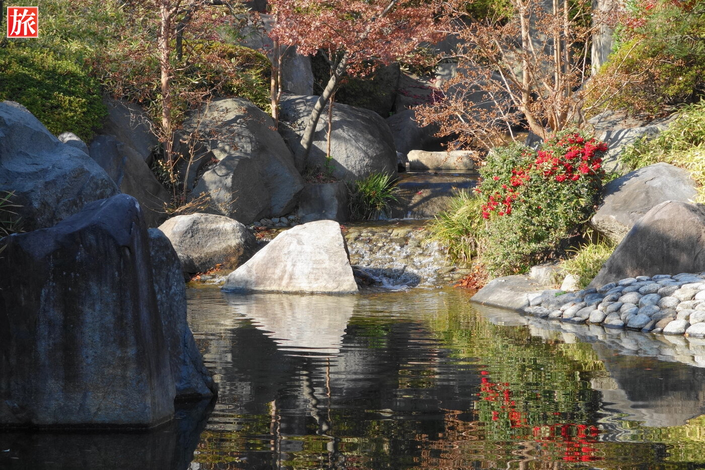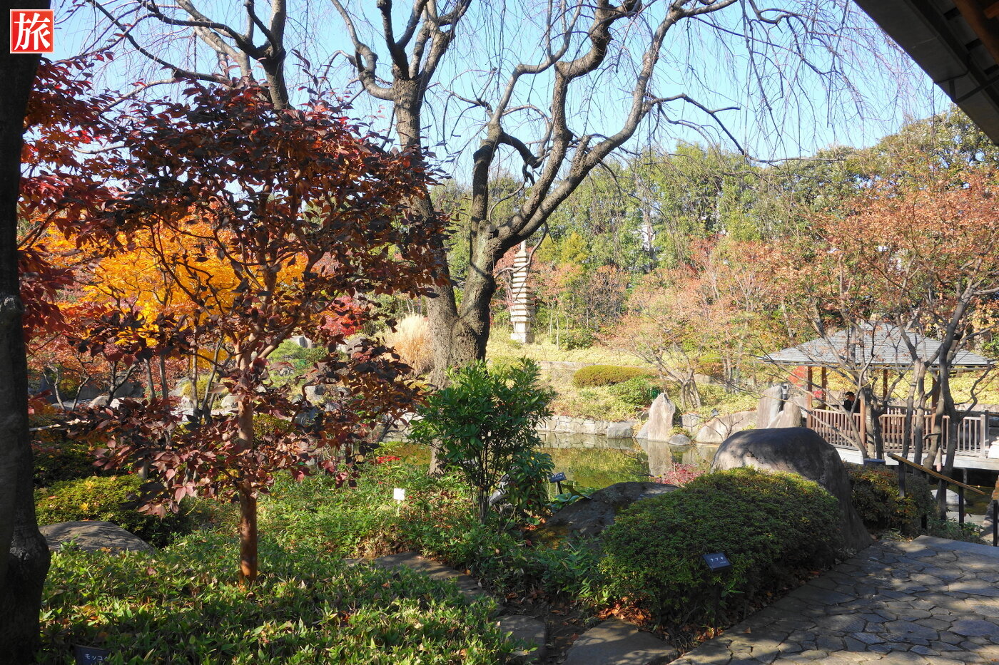 散策ルート > 目白庭園 > 自由学園明日館閑散な住宅街の中にあり、庭園は数寄建築の「赤鳥庵」や「六角浮き見堂」が配され、外側は、長屋門と築地塀(ついじべい)で囲まれています。こじんまりした庭園は、池を取り囲むように園路が設けられていて、石塔、や滝等を鑑賞することが出来ます。紅葉の時期には少し遅く、見ごろは過ぎてしまいましたが、都会の喧騒から逃れ、短い時間でしたがリフレッシュできました。こちらの散策時間は20分程度でした。