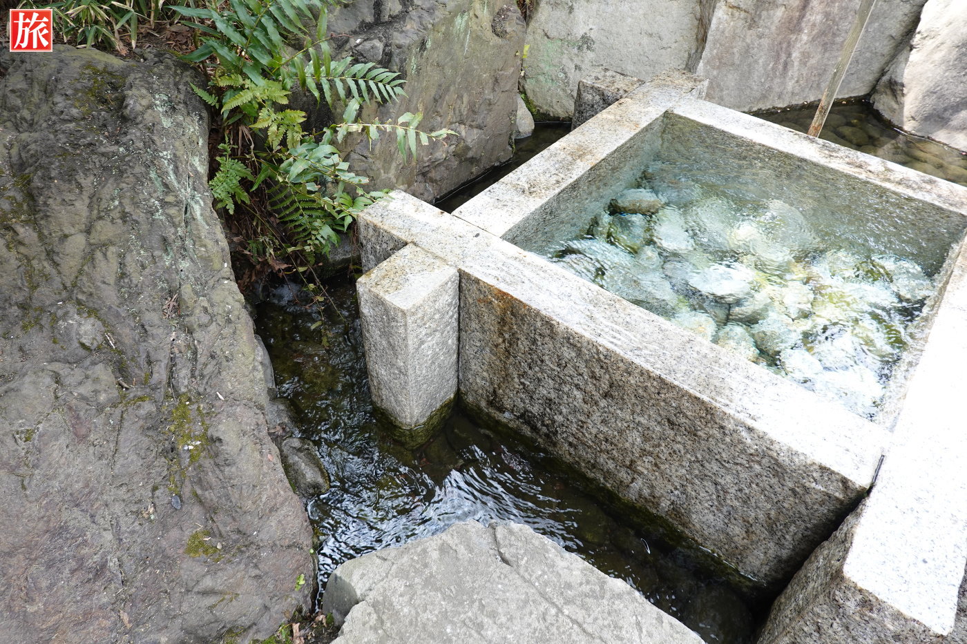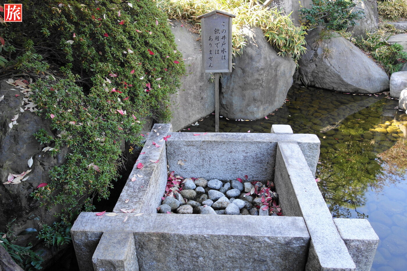 枡形の井戸。井戸付近から滝方向を望む。池近くにある錦花池坊の野外オブジェです。