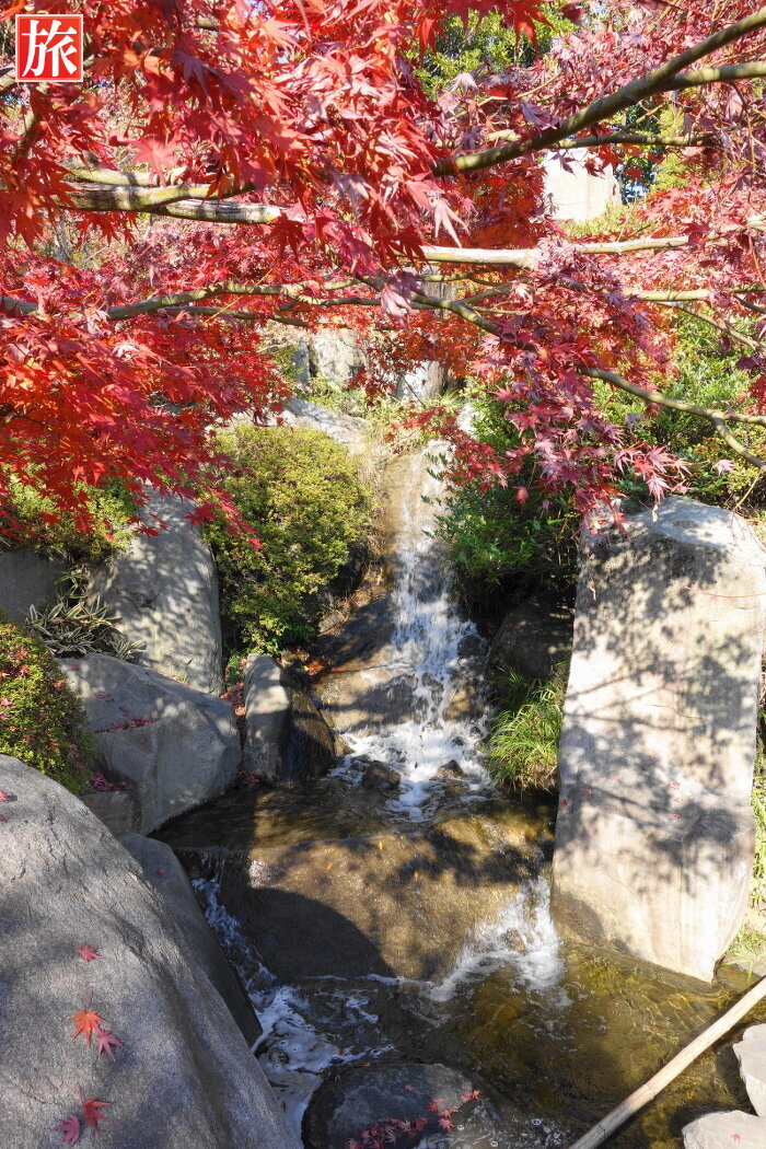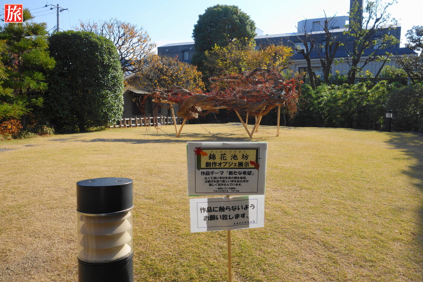 来年の新しい命の息吹をテーマとした錦花池坊の野外オブジェです。滝見台から見た紅葉と滝。