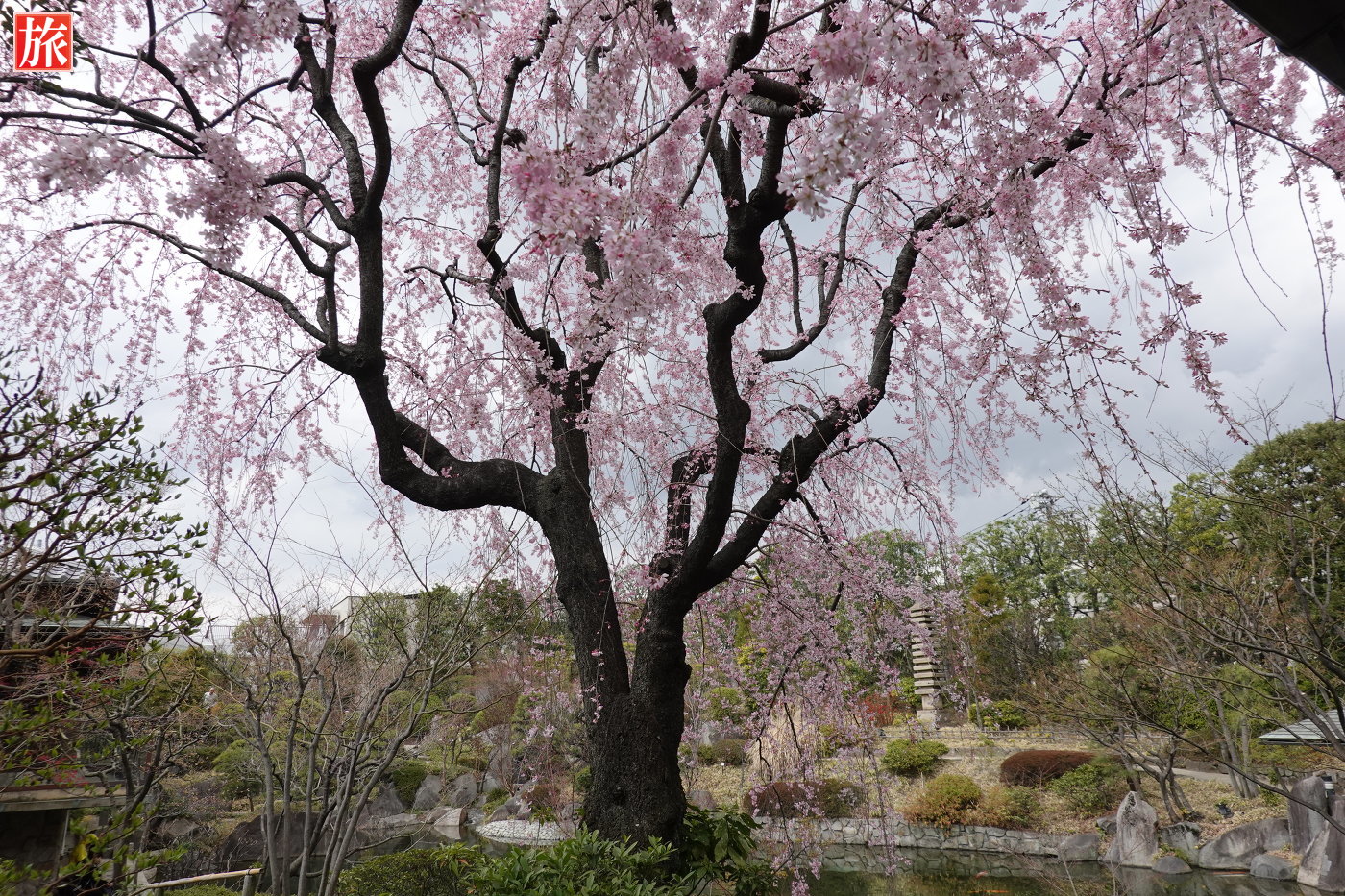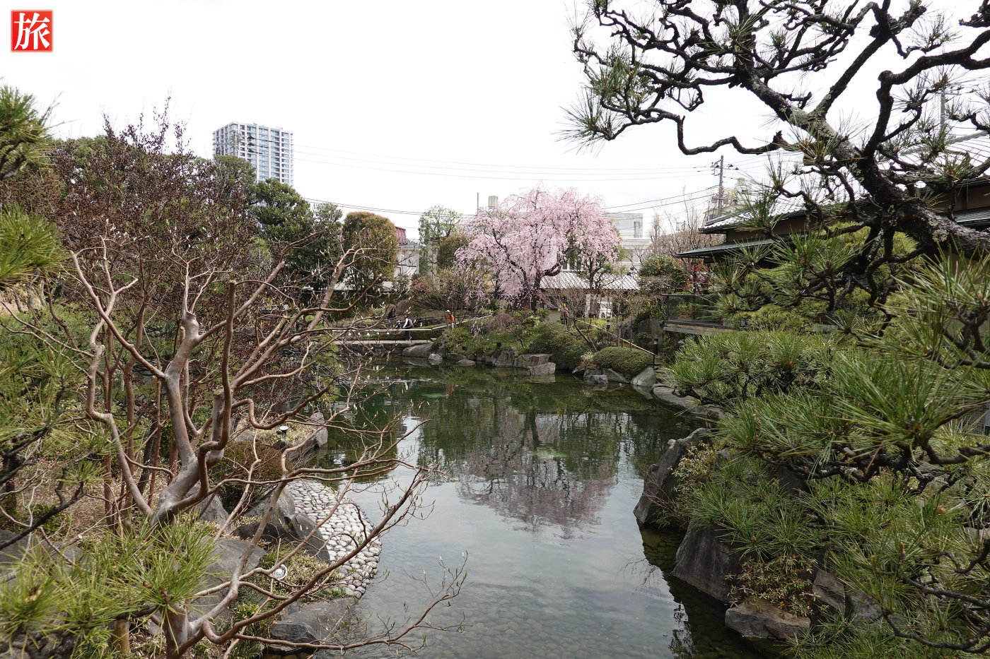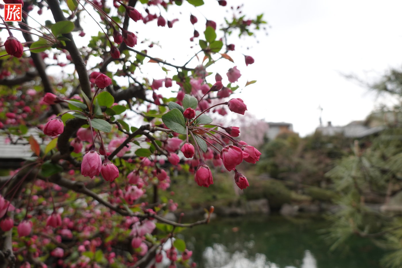 赤鳥庵とシダレザクラ桜。六角浮き見堂と桜。