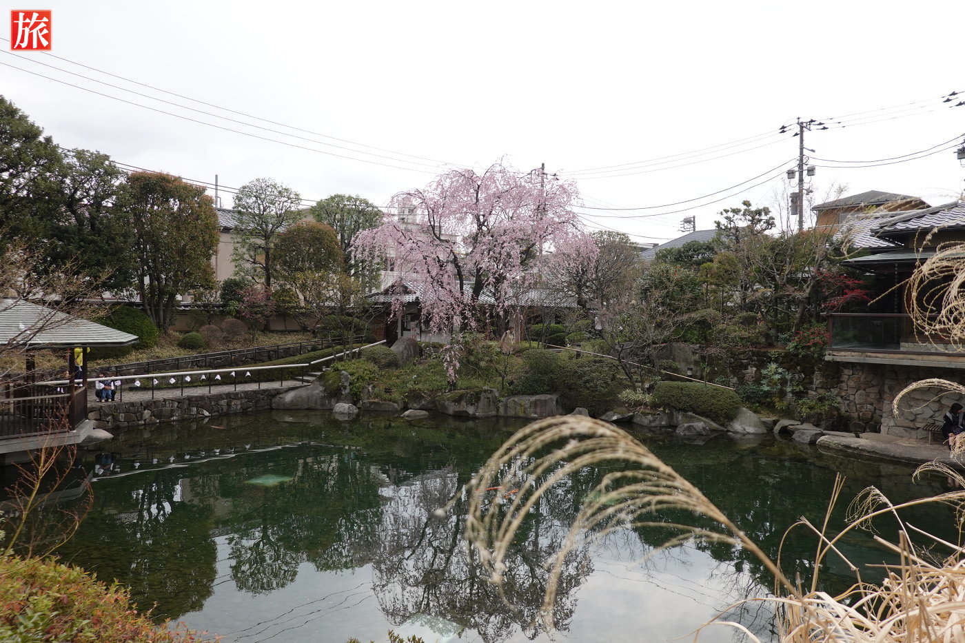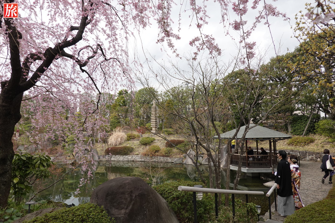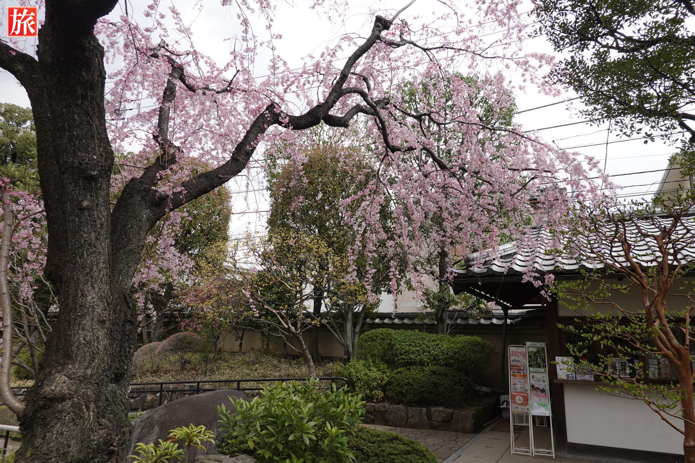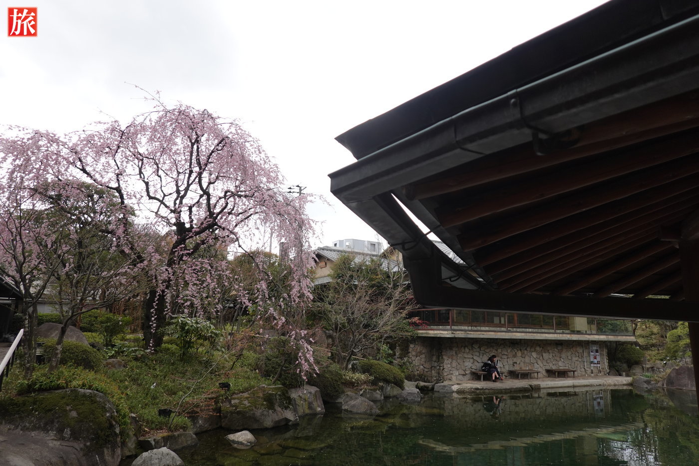 赤鳥庵とシダレザクラ桜。六角浮き見堂と桜。