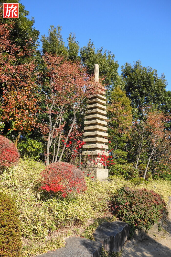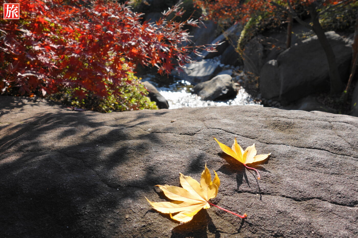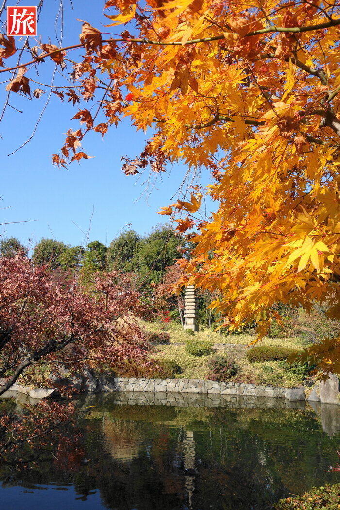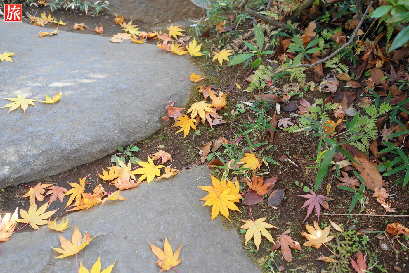 園路に散ったもみじ。「赤鳥庵」方向から石塔を望む。池と「六角浮き見堂」。