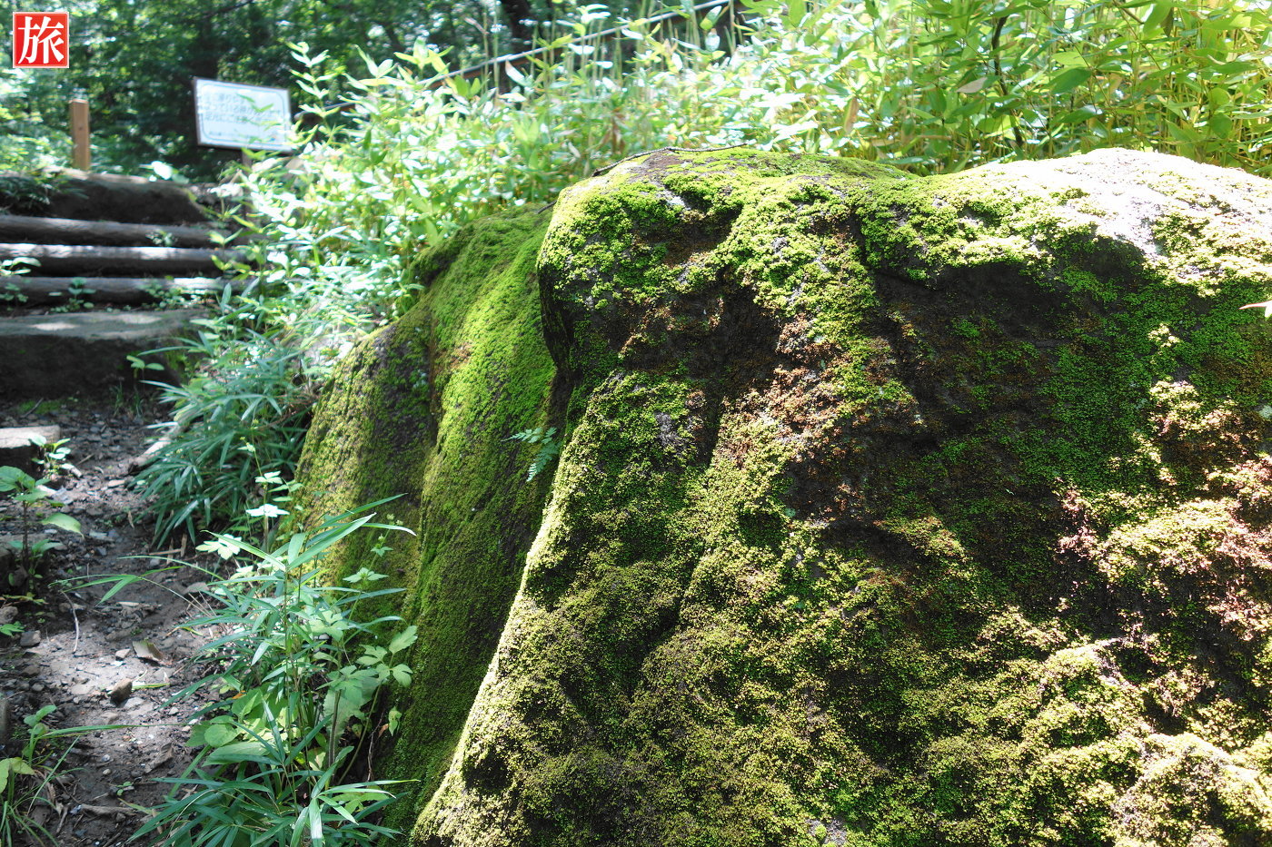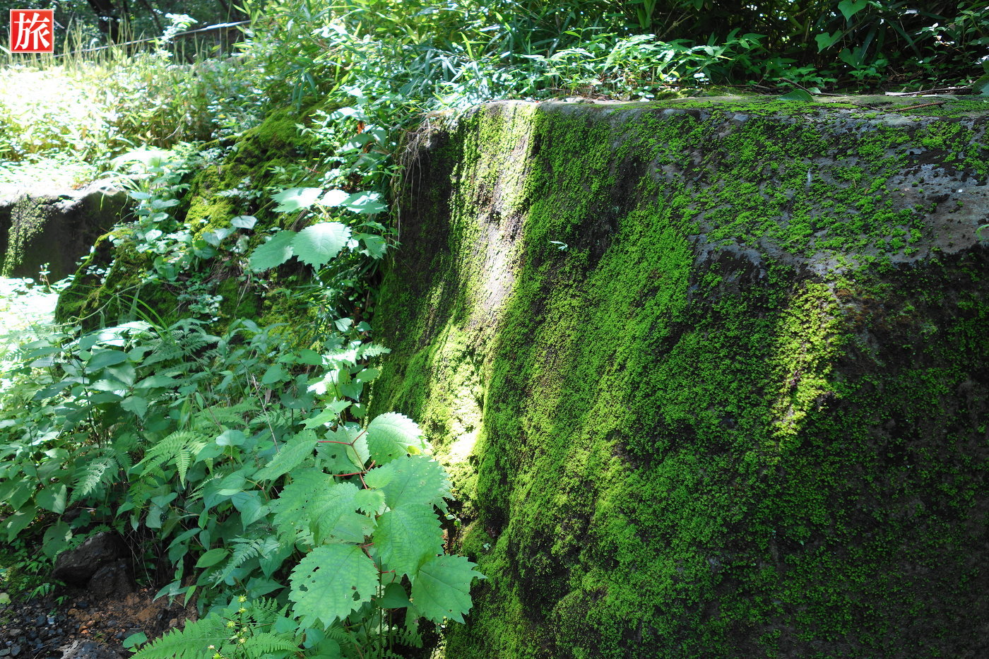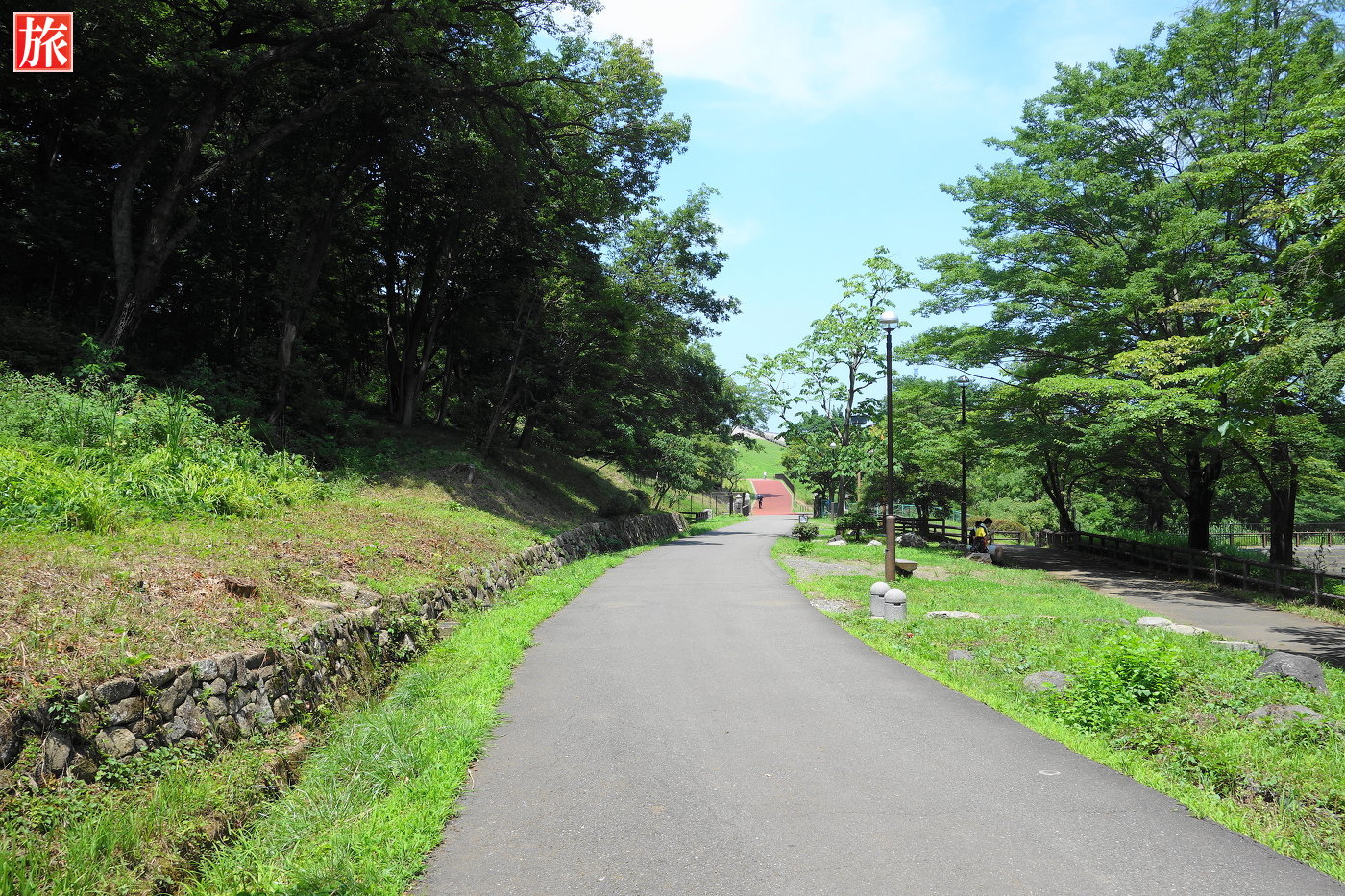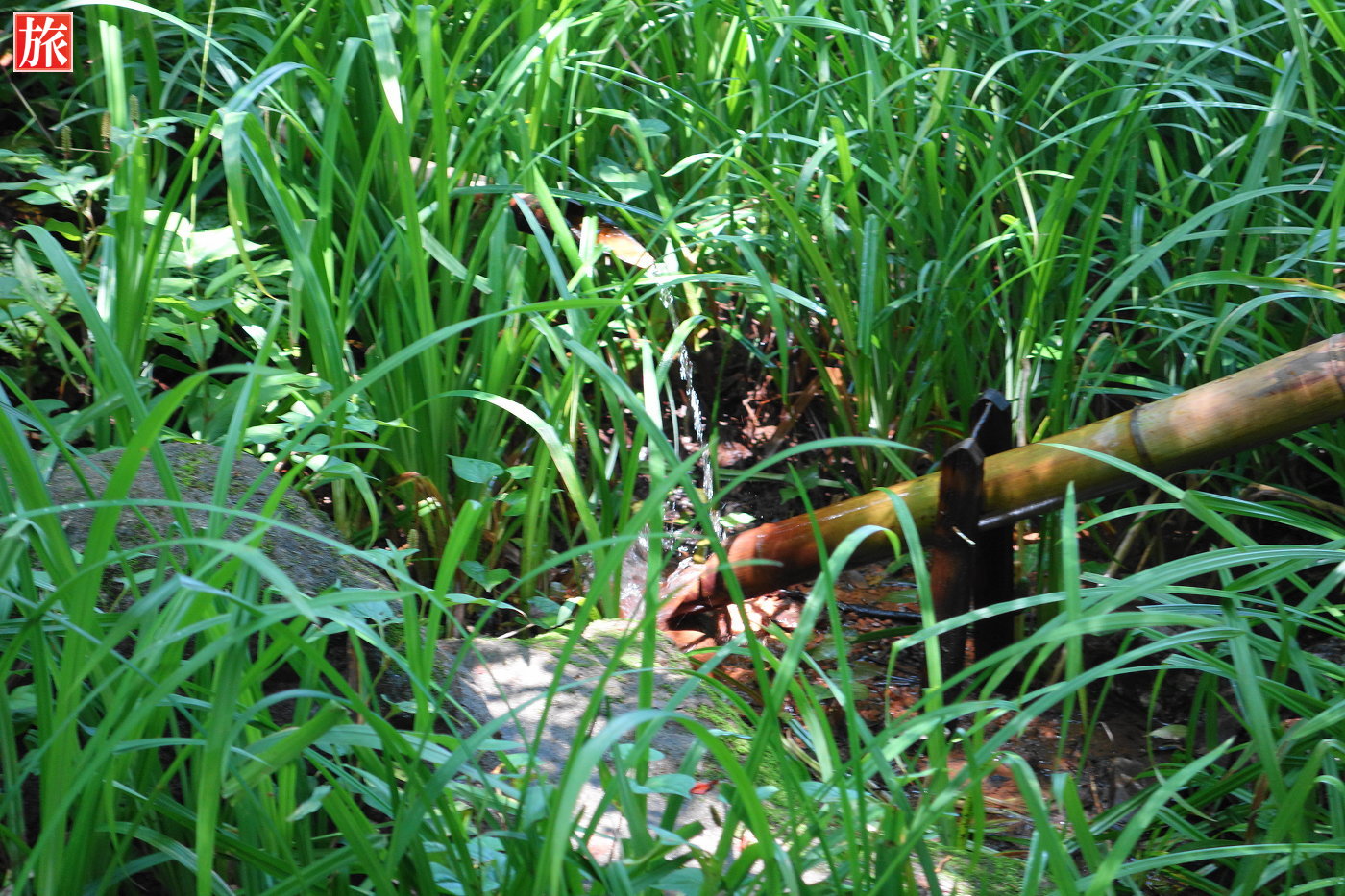 「鹿おどし」(ししおどし)たっちゃん池付近から見た公園南門方向と北側方向の道。湧水の池は緑の草に覆われていました。