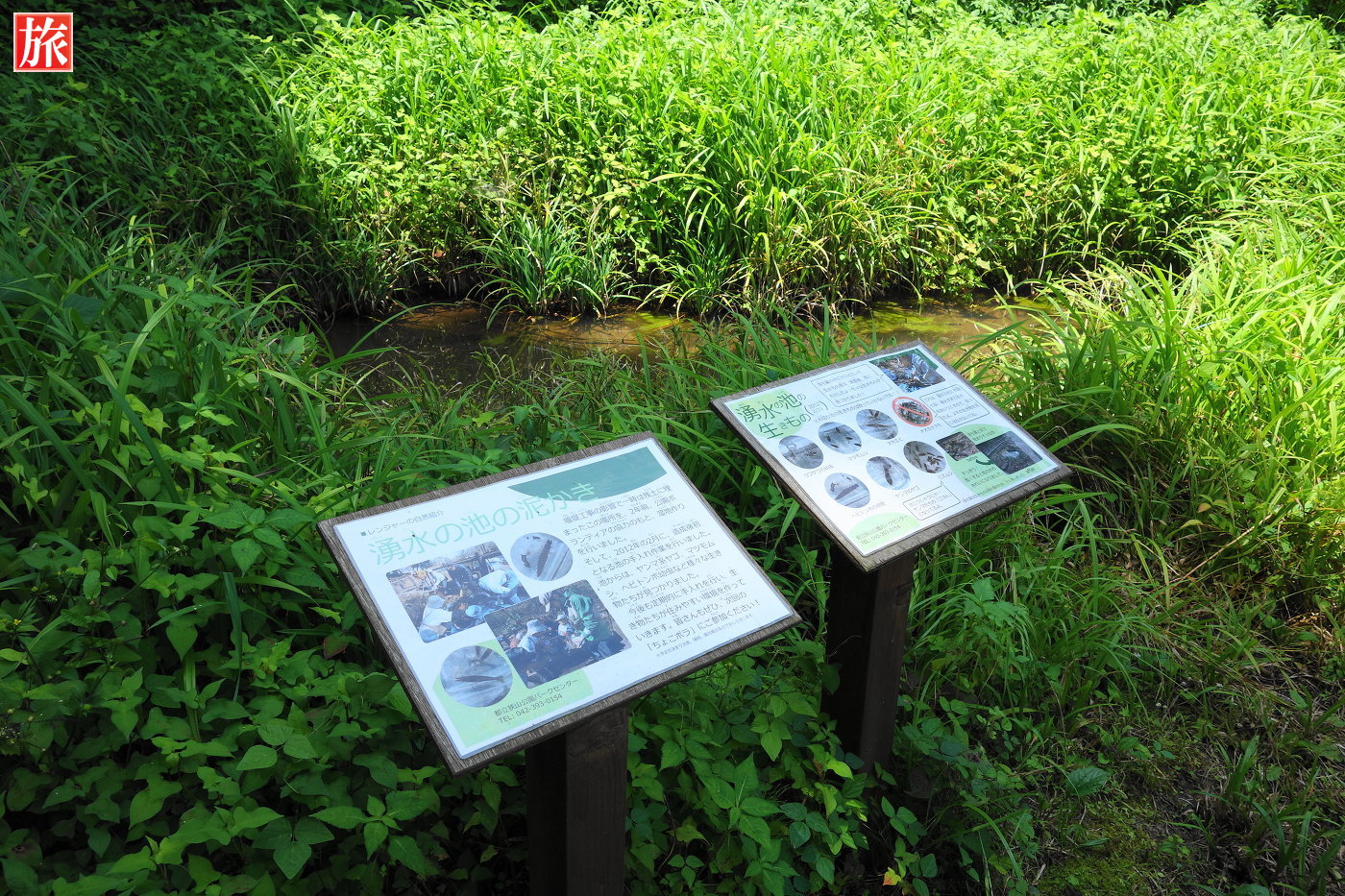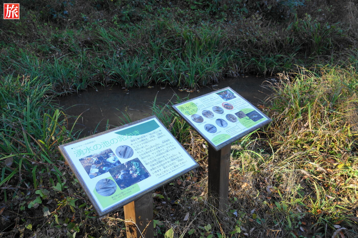 都立狭山公園駐車場に抜ける道に湧水の池があります。湧水の池の説明板です。湧水の池。