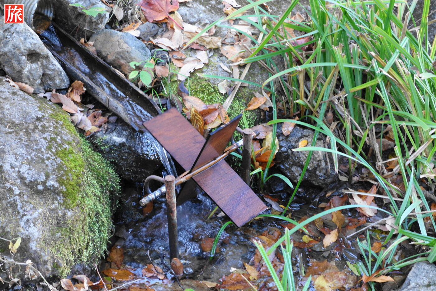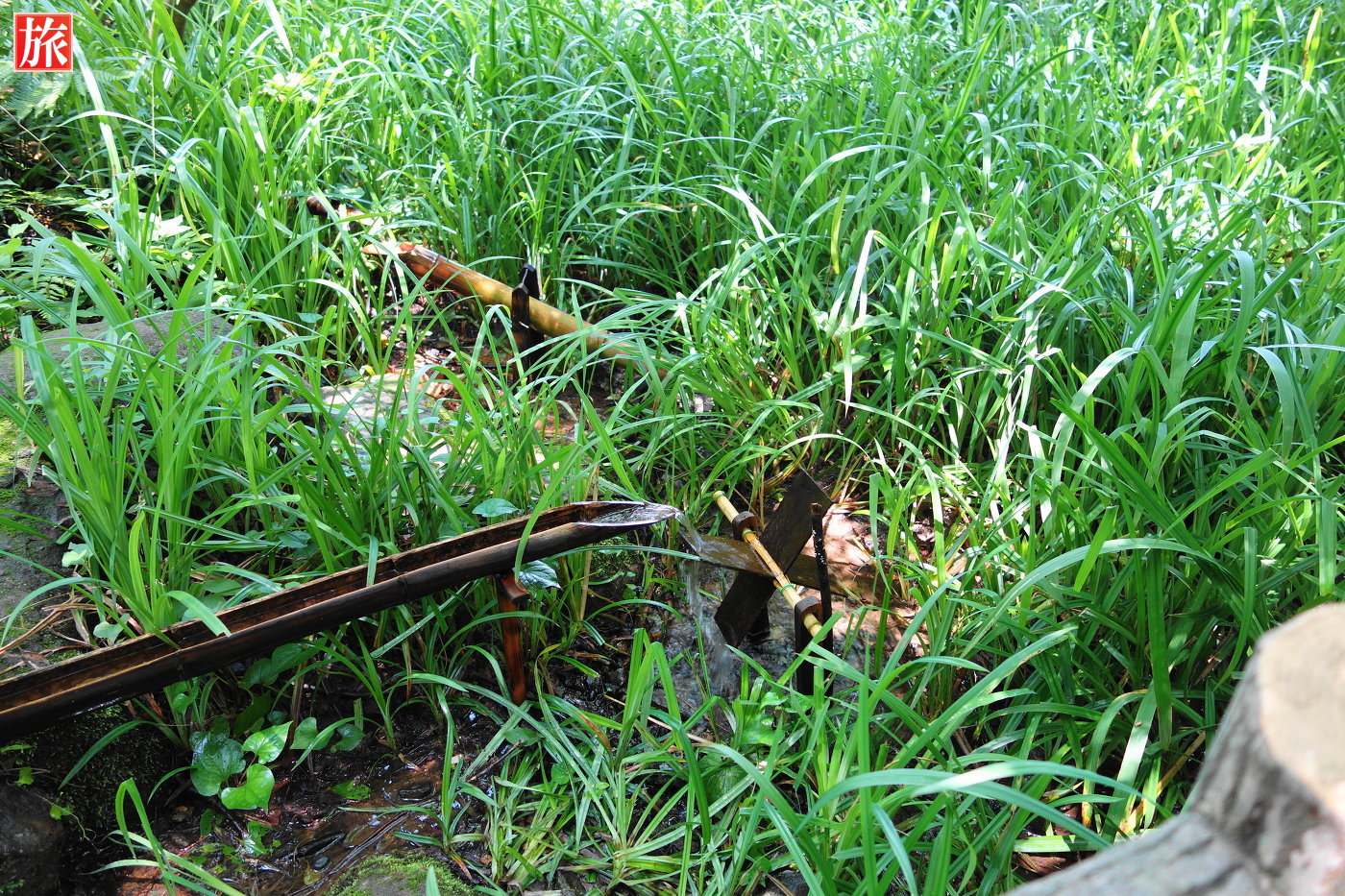 池の南側には「鹿威し」(ししおどし)と小さな水車。鹿おどしからはコンッと響きわたる音がしました。苔むした石。