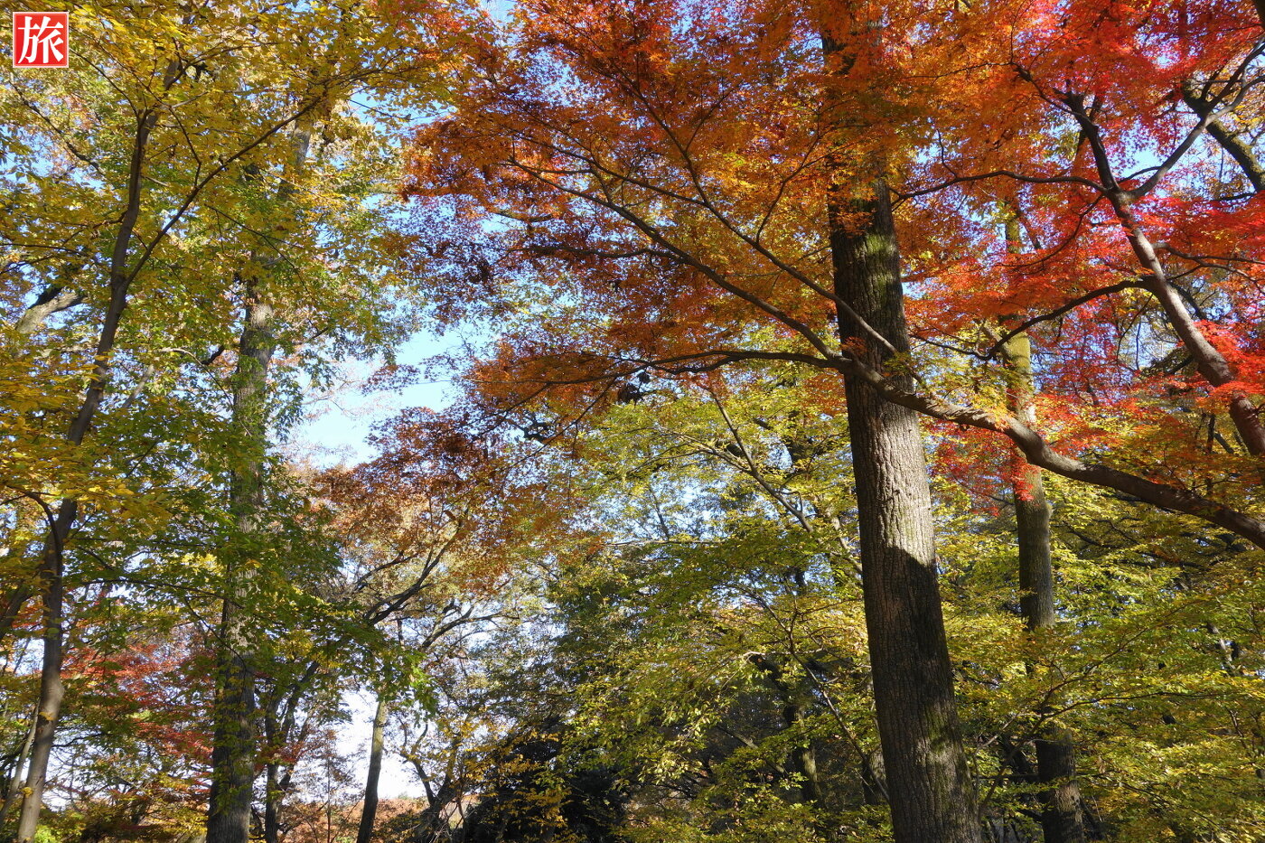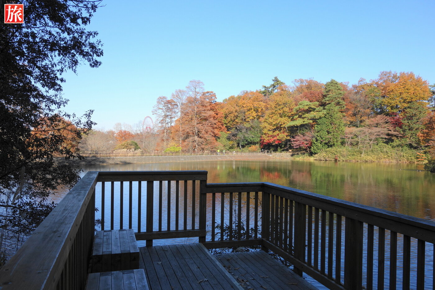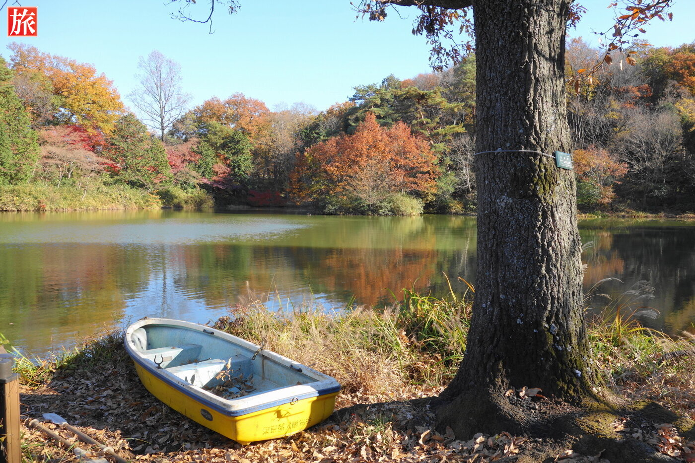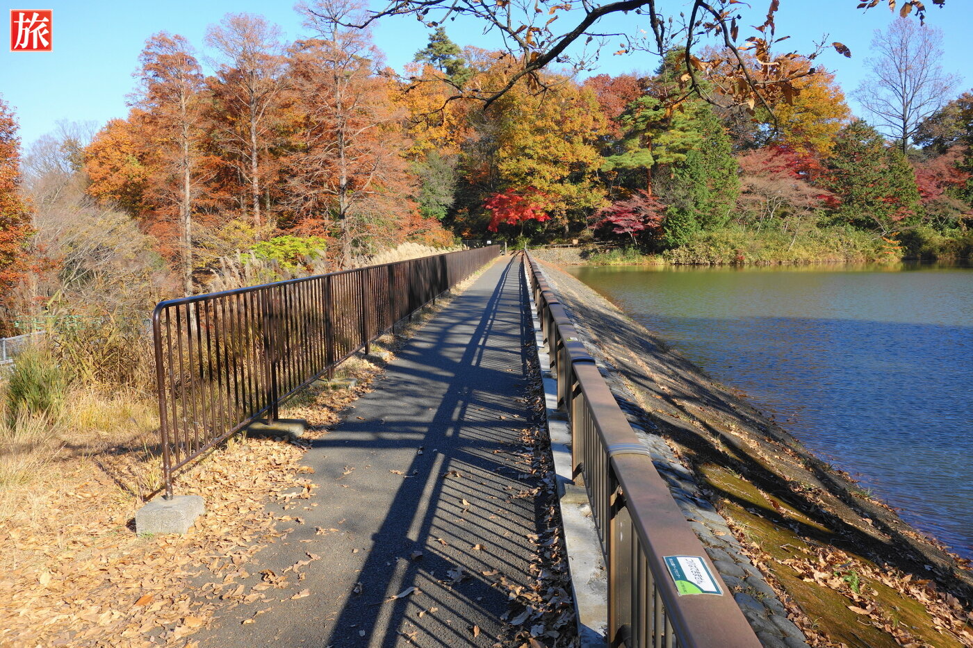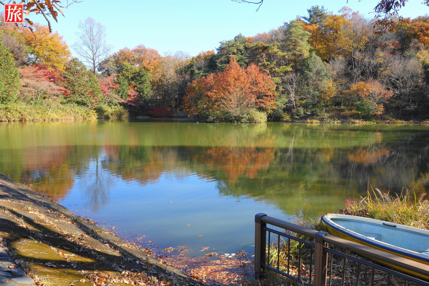紅葉と宅部池(たっちゃん池)の風景です。 手漕ぎボートがいい雰囲気を醸し出してます。北側にある通路。