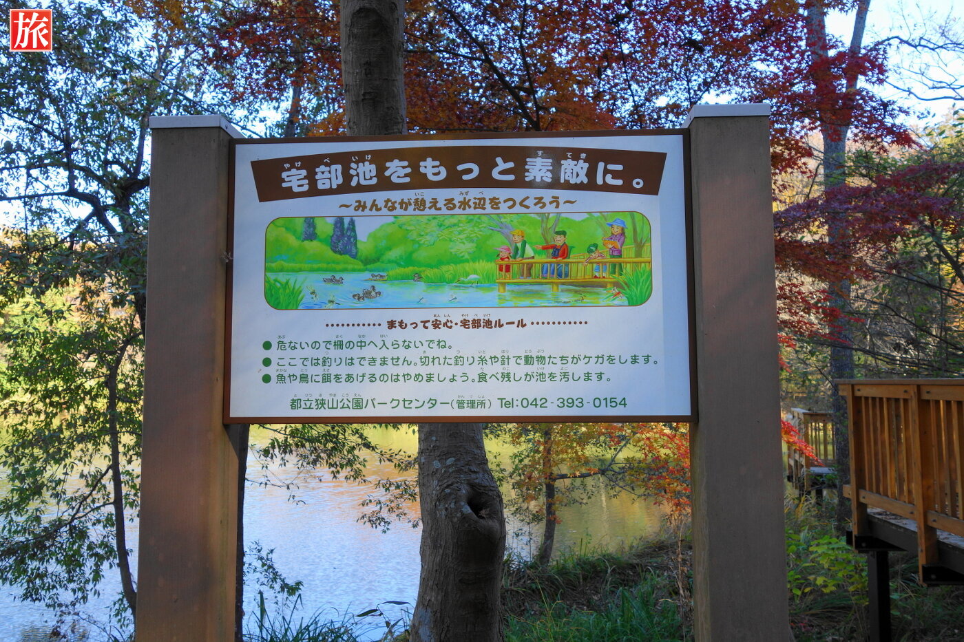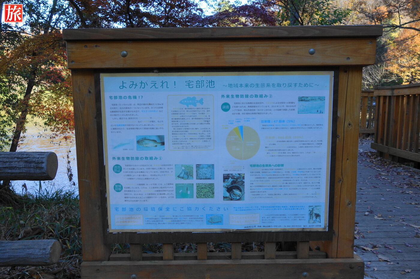 散策ルート 多摩湖(村山貯水池) > 都立狭山公園 > 宅部池(たっちゃん池)トータル、散策時間90分。宅部池は狭山公園の中央に位置し、北川の源流にあたります。心霊スポットとしても知られていることもあり散策してみました。池はあまり大きくはなく、水面は穏やかです。水深はあまり深くないようです。夜この池付近で、怖い噂が沢山ありますが、昼間はその気配を感じられませんでした。