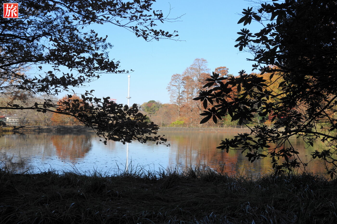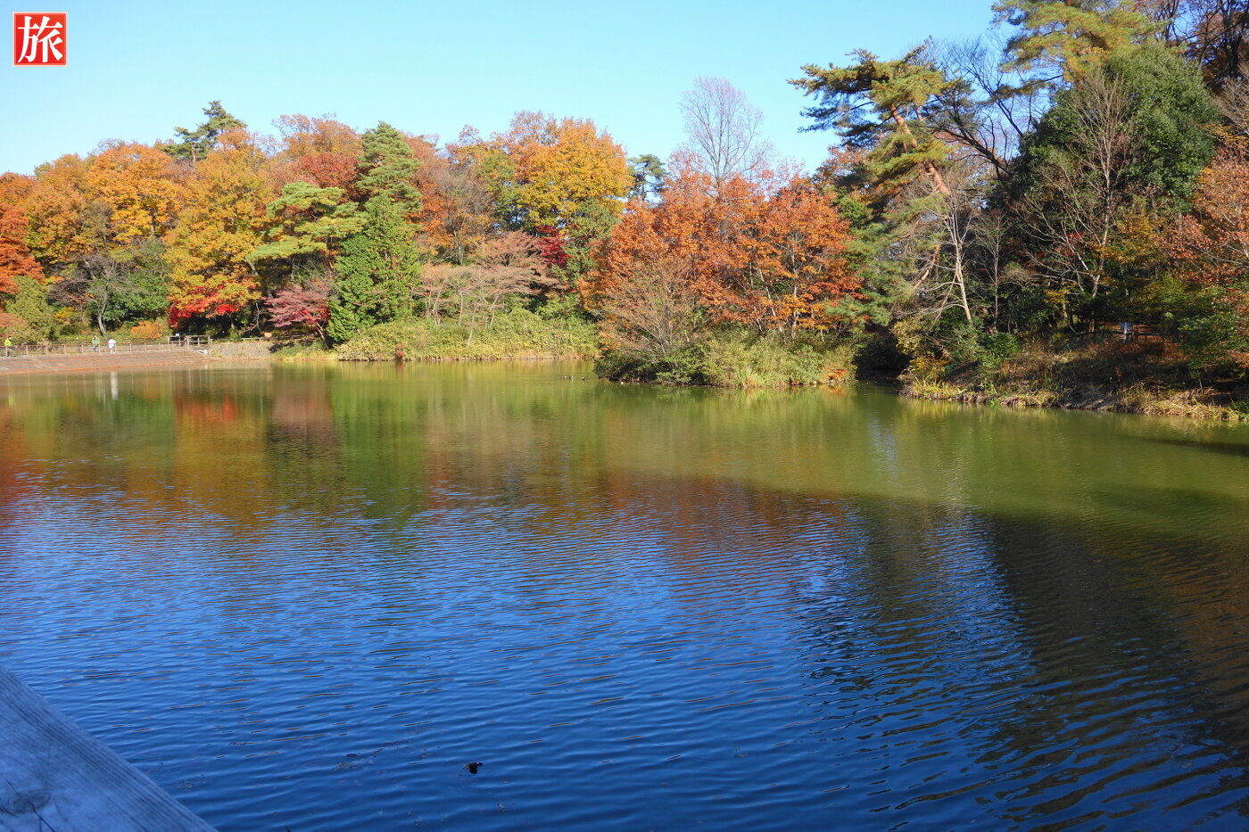 池の南側湿地にあった水車。南側から池を望む。紅葉との風景も良かった。公園南門(武蔵大和駅方向)へ抜ける道です。