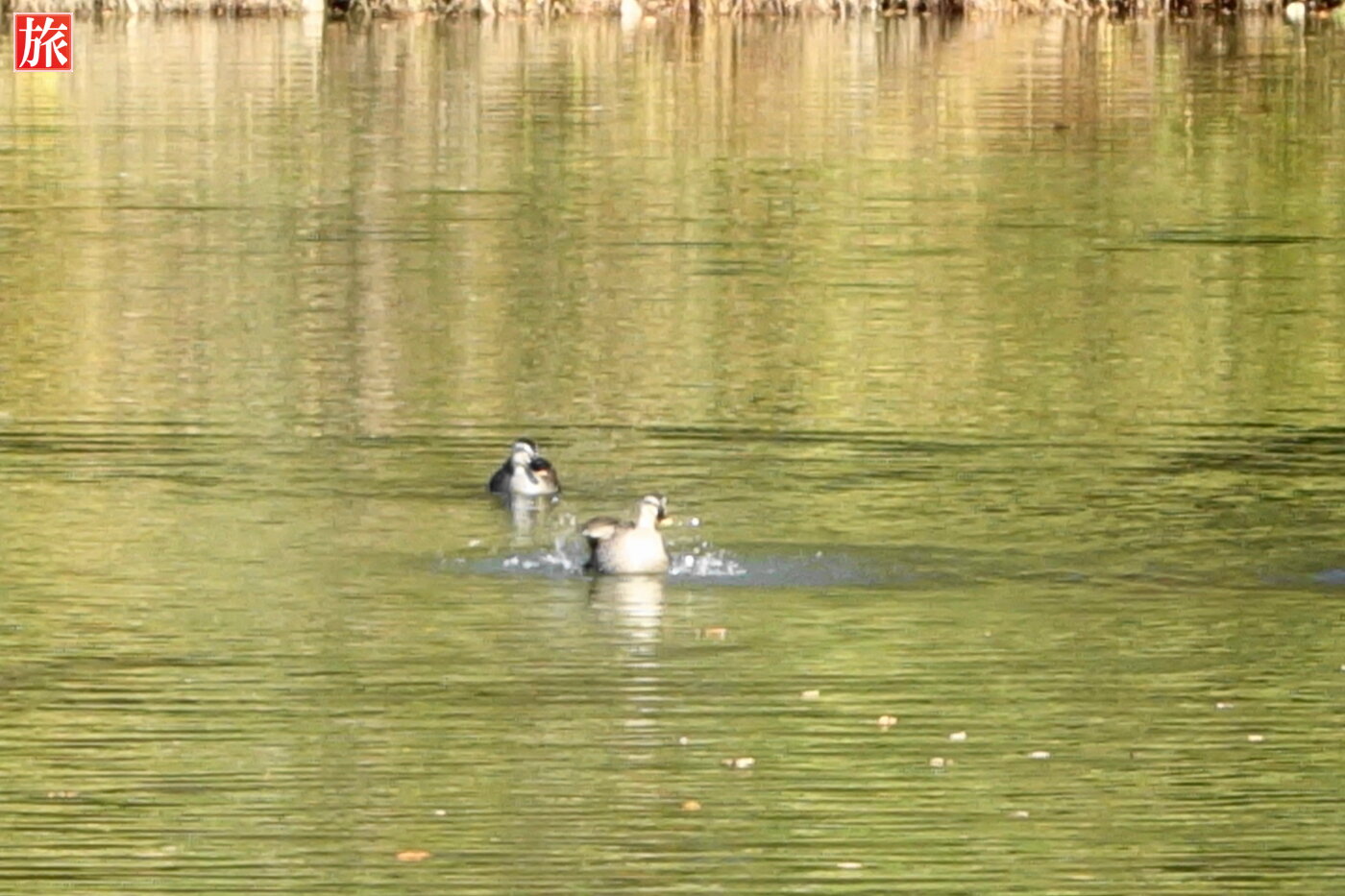 池の中央部を望む。池の南側。ウッドデッキから北方向の池を望む。鴨がいました。