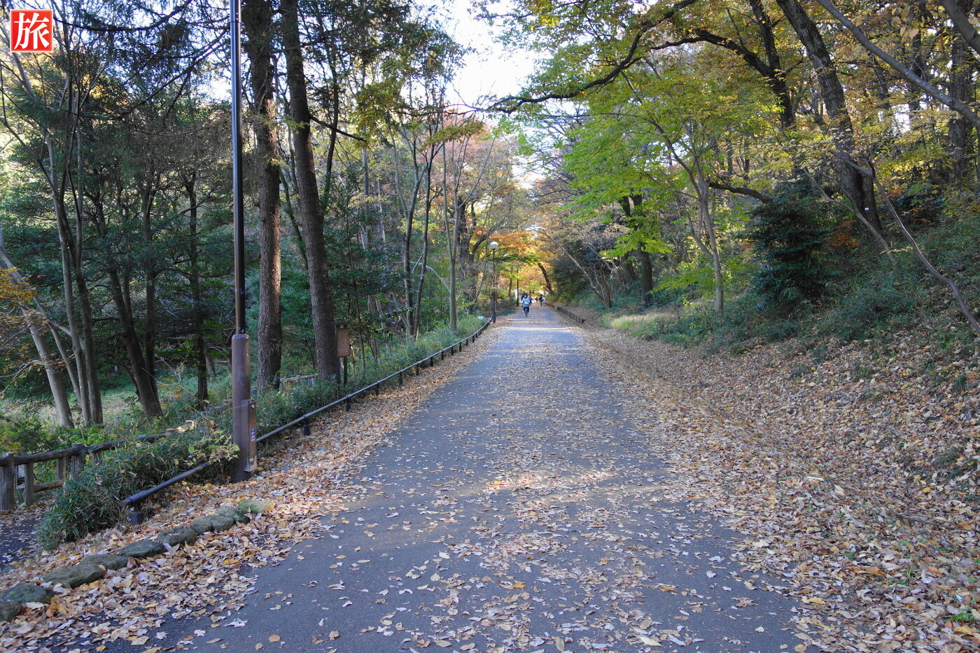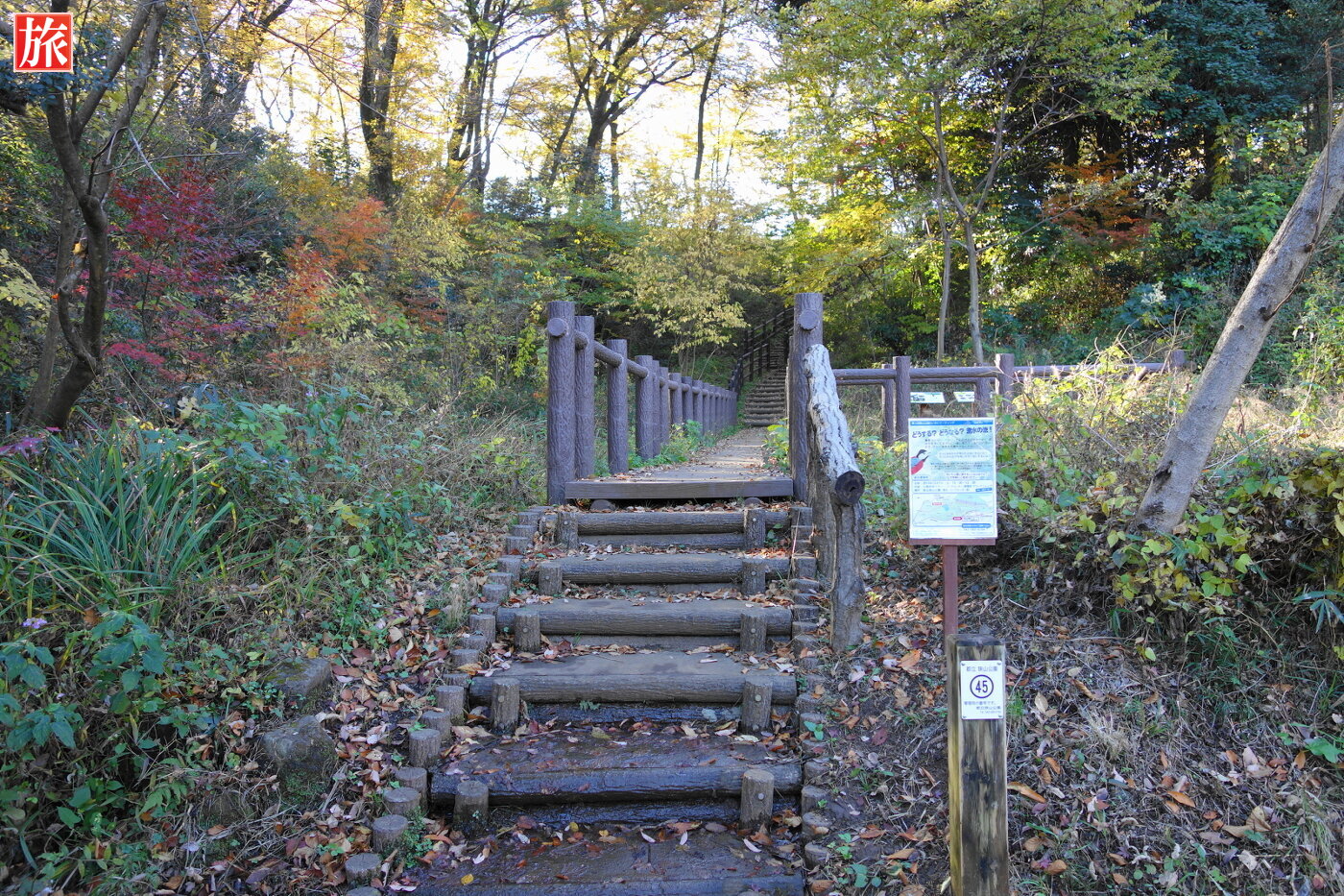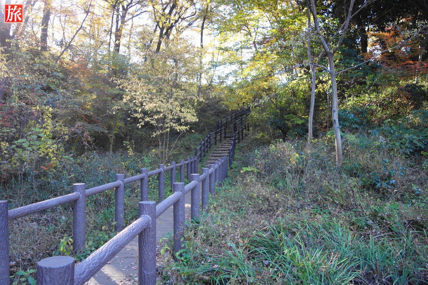 湧水の池を右手に、湧水の森の階段を上がっていきます。登りきると狭山公園駐車場(ダム南端入り口付近)