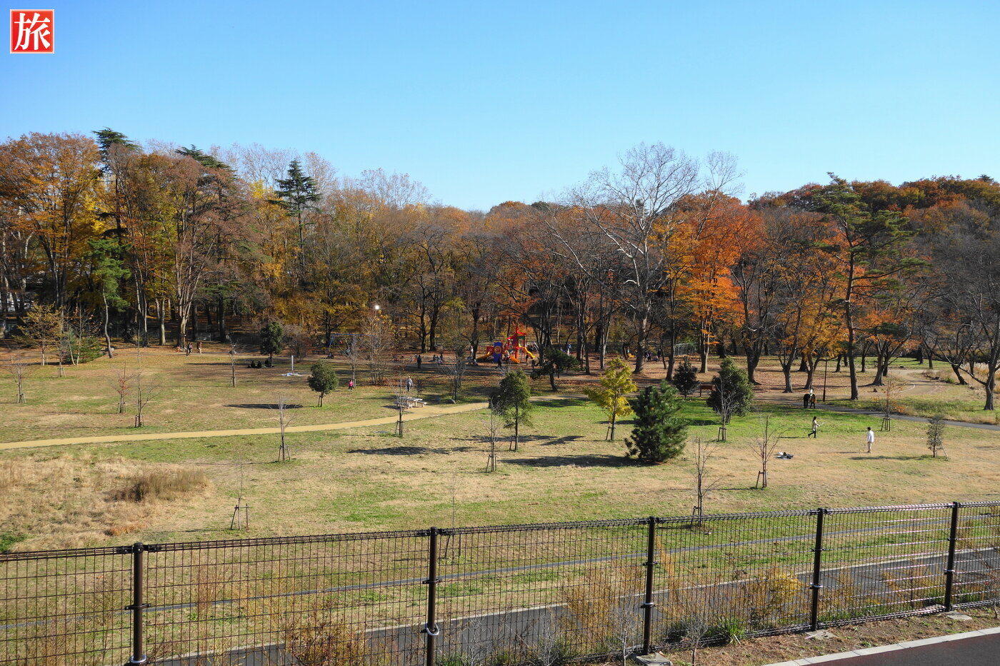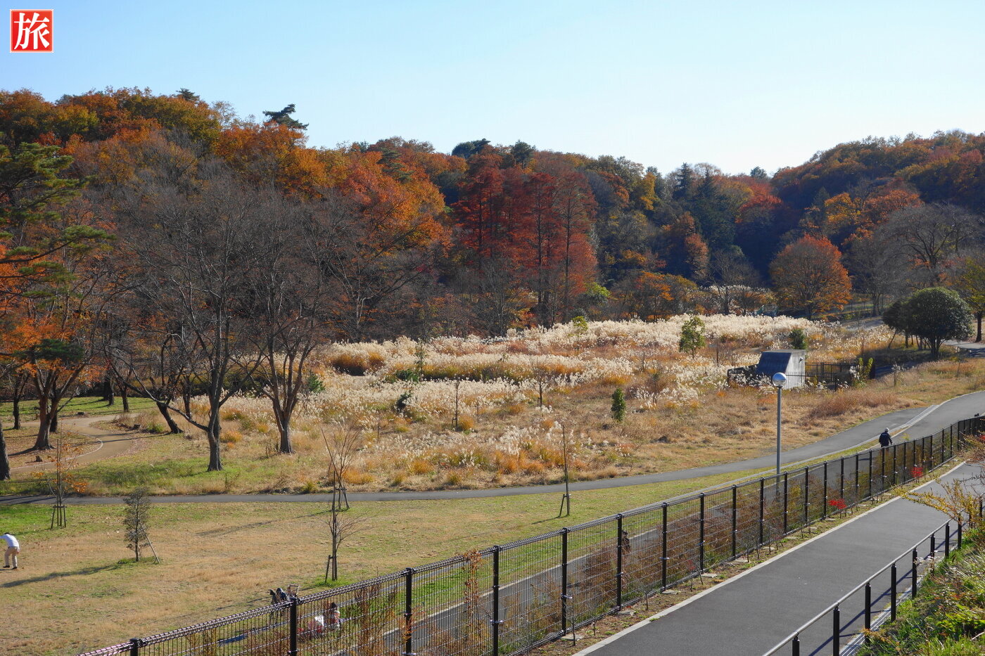南へ進み、中ほどから西武ゆうえんち方向を見た様子です。狭山公園、遊具広場方向を望む。宅部池(たっちゃん池)方向にススキの群生がありました。